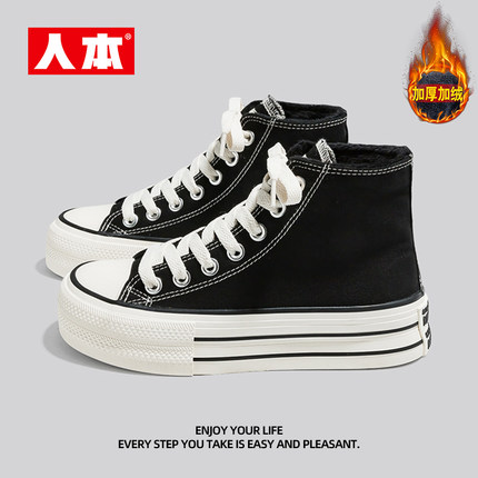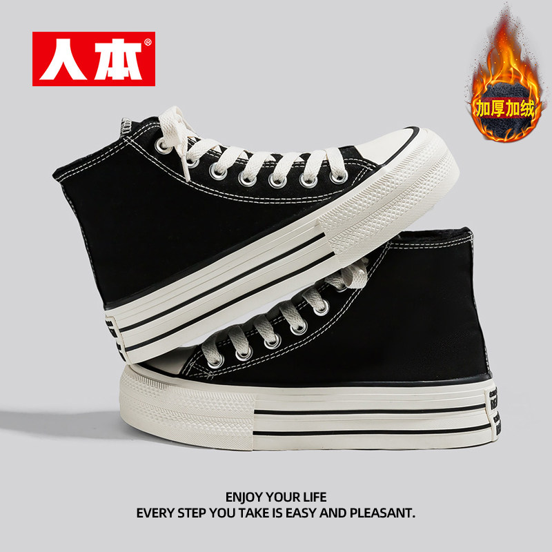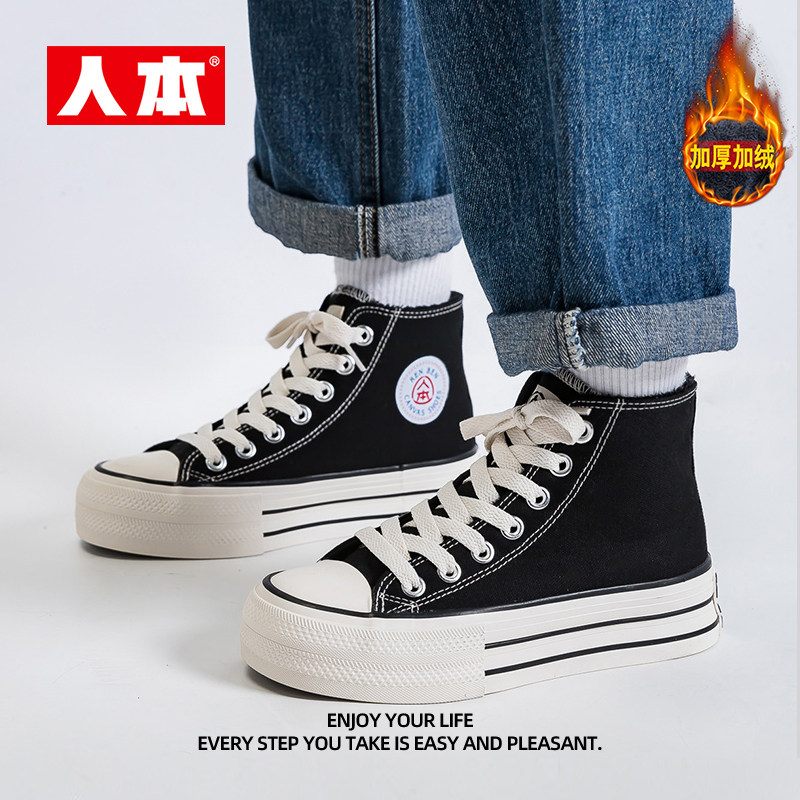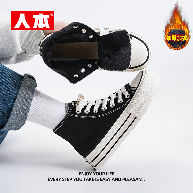 人本冬季二棉鞋子女2025新款爆款加绒加厚保暖女鞋休闲高帮帆布鞋