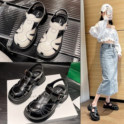 罗马凉鞋女士2025夏季新款真皮包头猪笼鞋厚底粗跟编织单鞋休闲潮