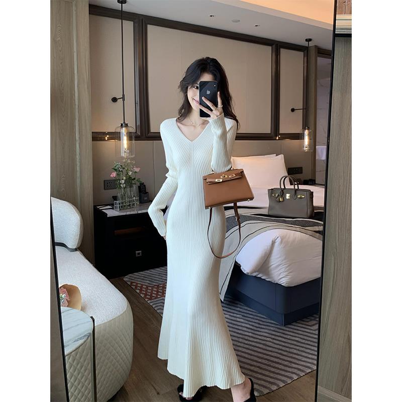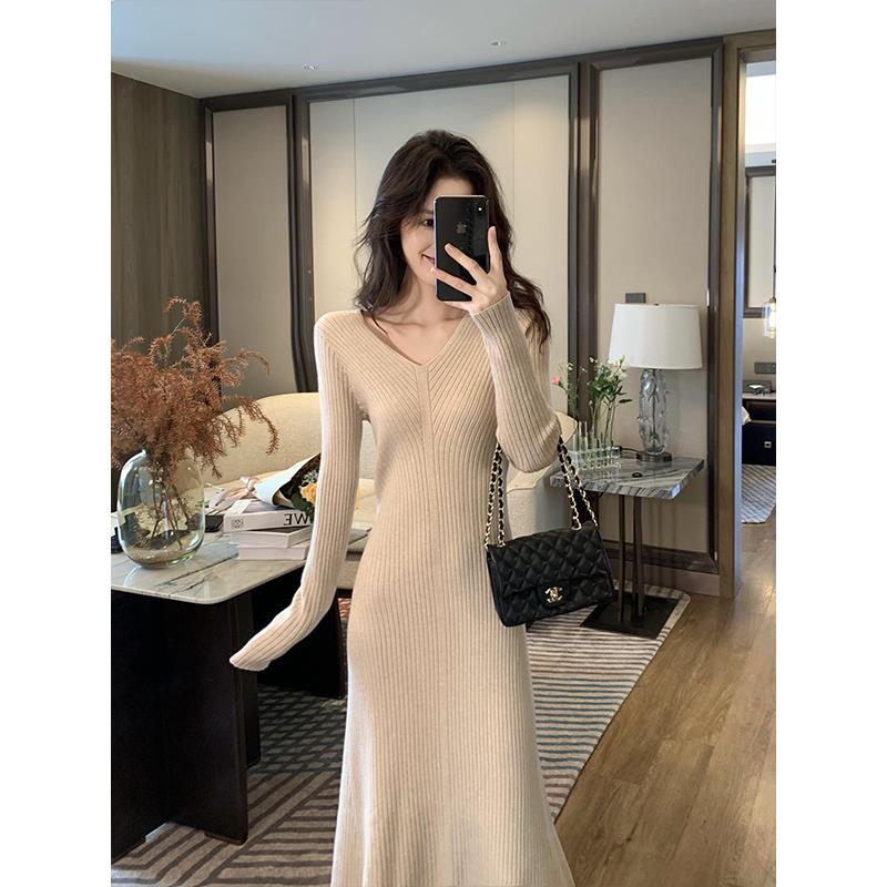 林妍儿v领针织连衣裙女秋冬季修身气质内搭打底毛衣包臀鱼尾裙春
