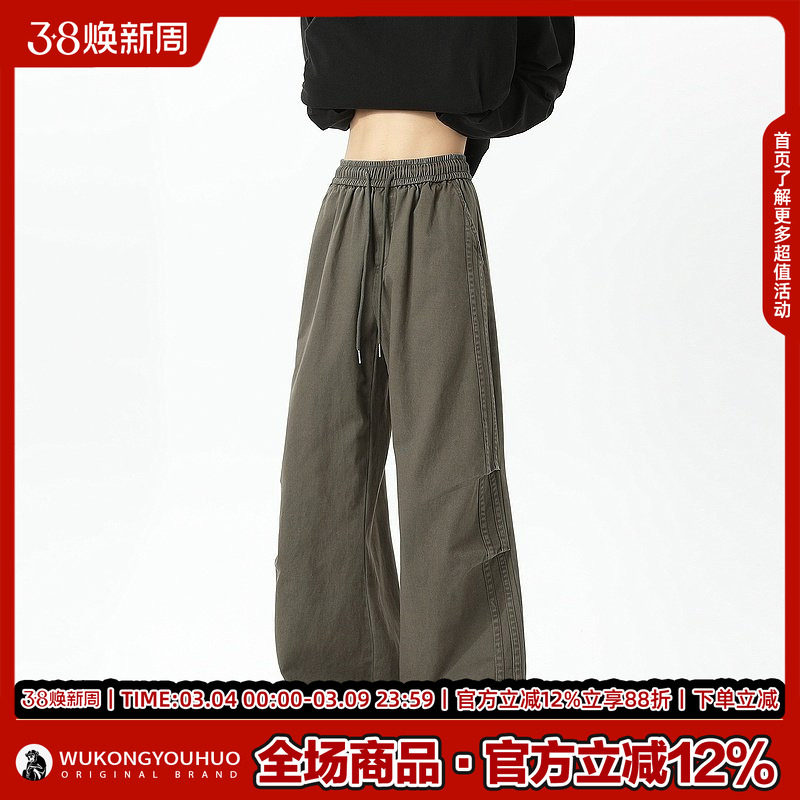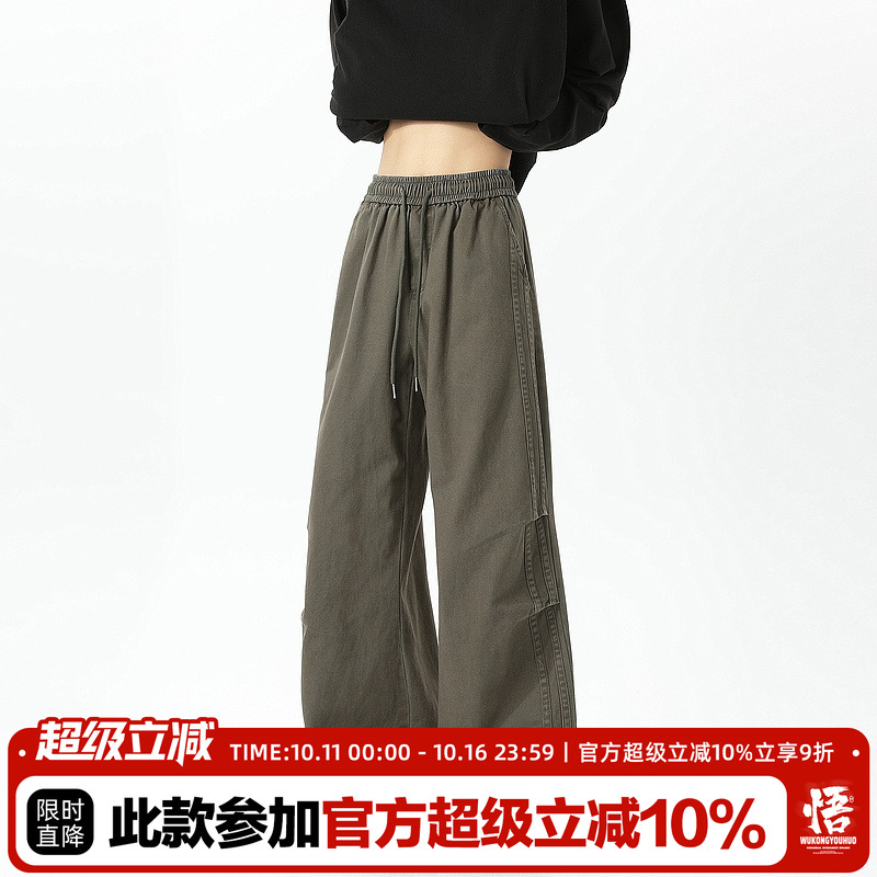 悟空有货潮牌美式褶皱水洗直筒工装裤男复古宽松高街阔腿休闲长裤