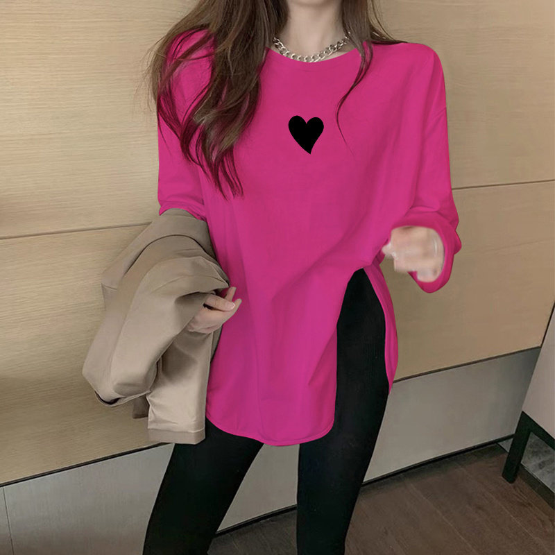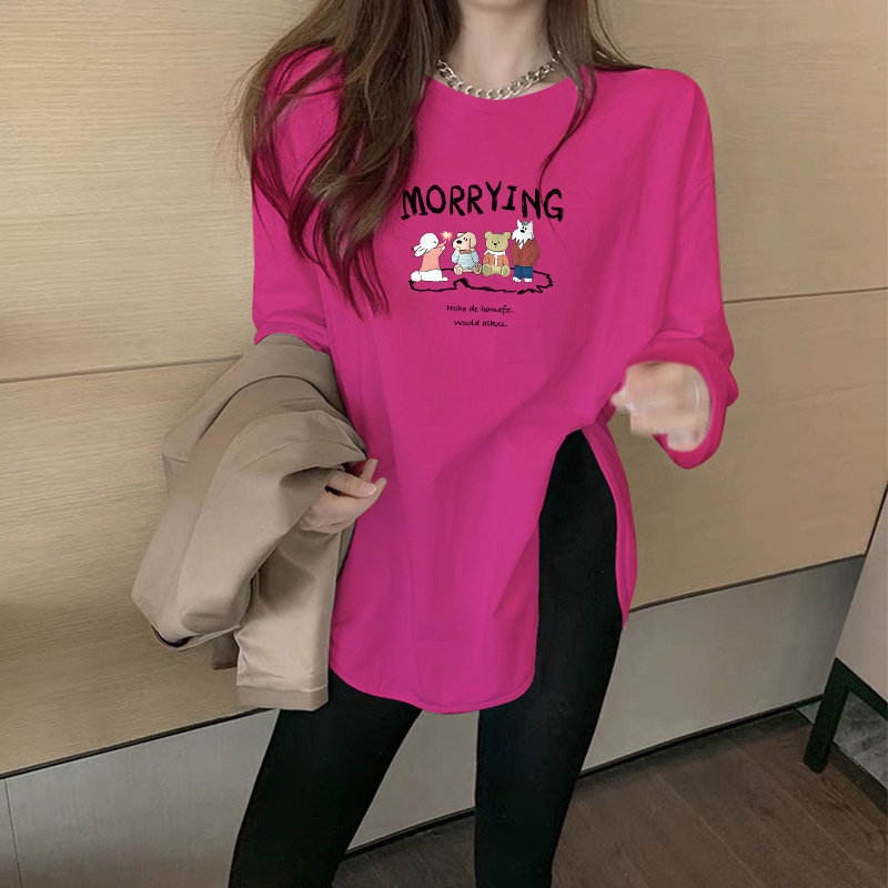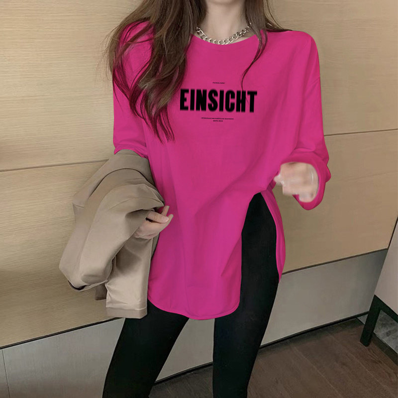 圆领纯色磨毛打底衫女秋冬季中长款宽松内搭长袖t恤弧形下摆上衣