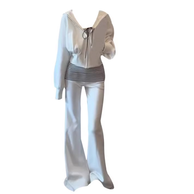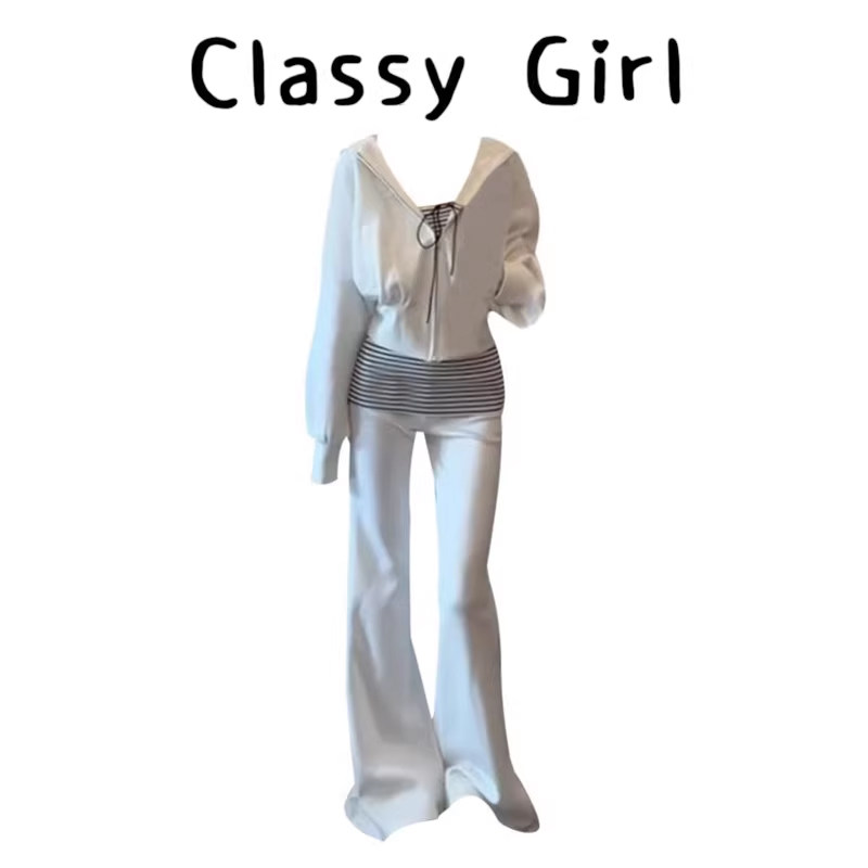 2026超火欧货白色休闲运动套装女春减龄洋派卫衣微喇叭裤三件套装