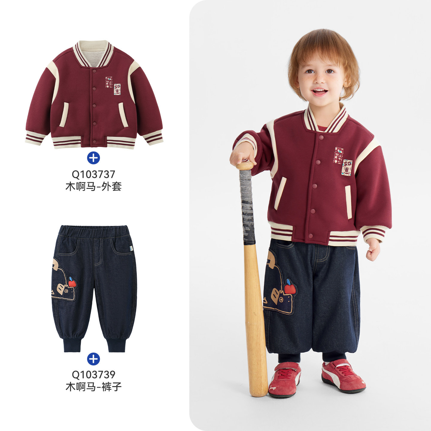 [骏马福裳贝乐绒]齐齐熊宝宝加绒棒球服外套男童冬款儿童新年红色