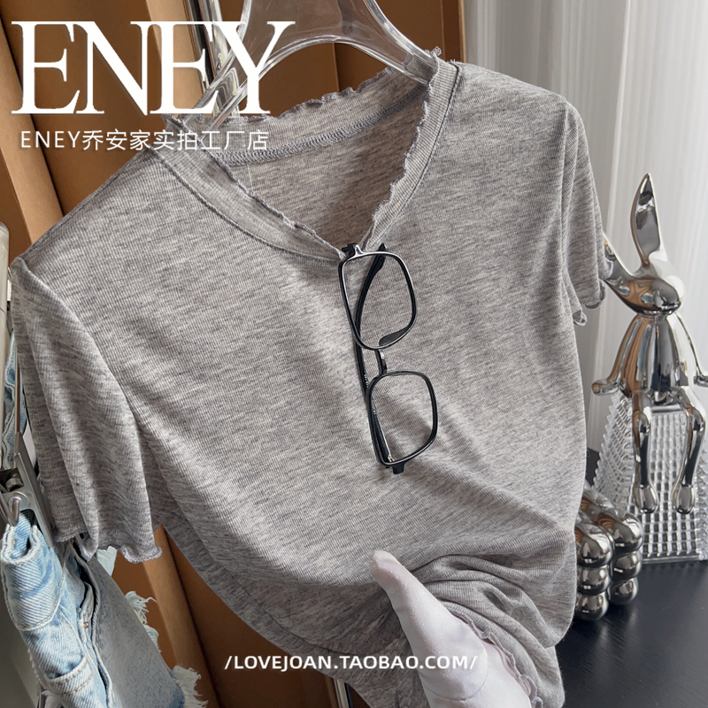 微透韩国鹅黄色夏季修身显瘦女纯欲辣妹百搭木耳边小个子短袖T恤