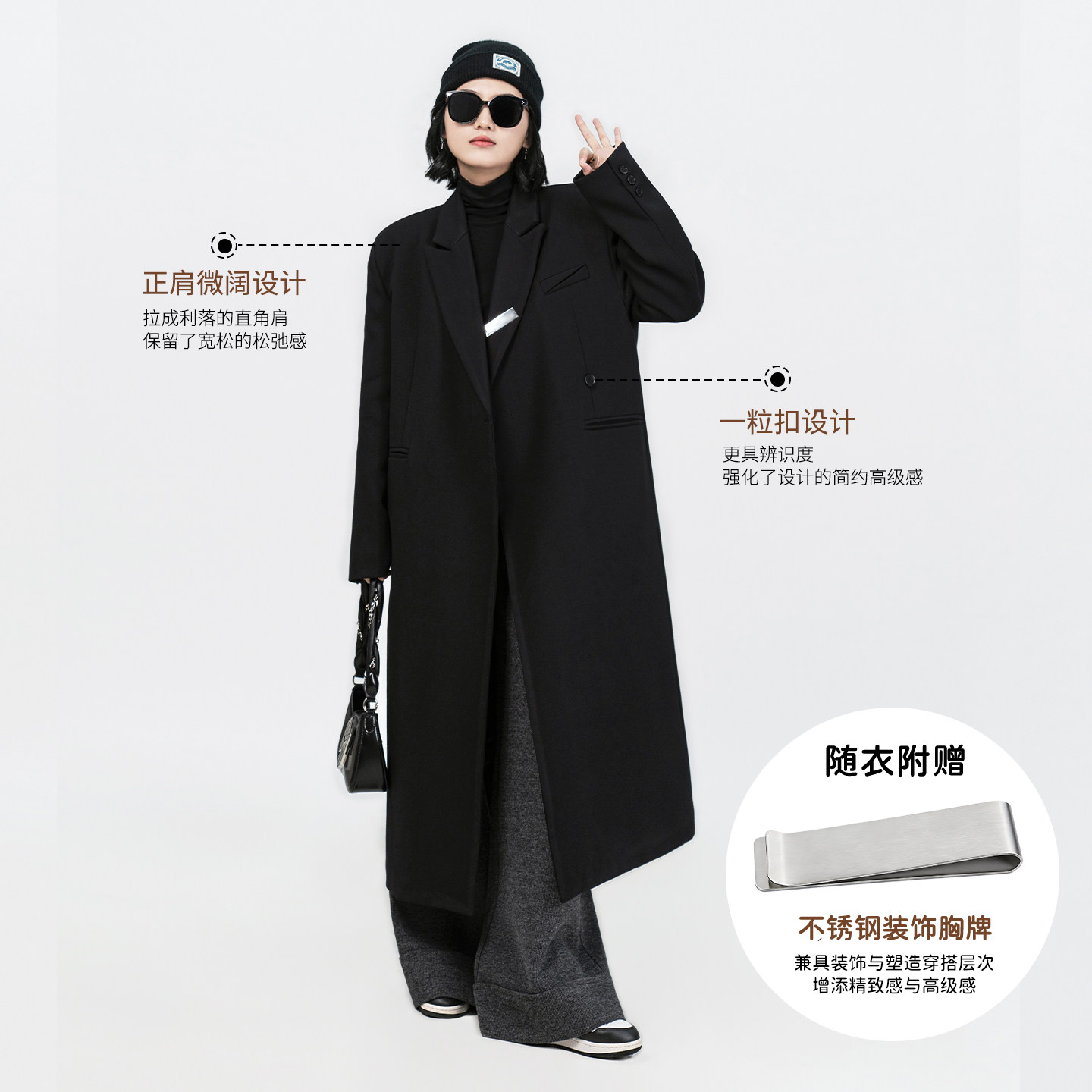 长款黑色西装外套女冬加厚韩版一粒扣大衣老钱风正肩直筒h型风衣