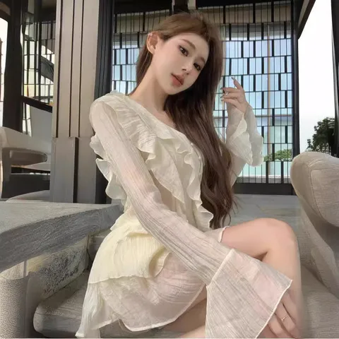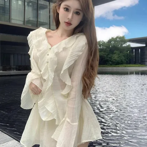防晒长袖衬衣法式喇叭新款风春夏季欲v领雪纺纯女装荷叶边