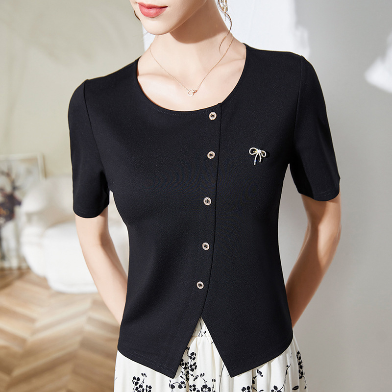 清仓短袖t恤女夏新款女装气质圆领纯色棉体恤下摆开叉褶皱小衫