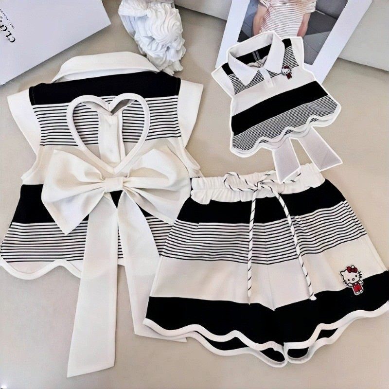 2025夏季新款女童套装洋气卡通可爱蝴蝶结露背条纹上衣短裤两件套