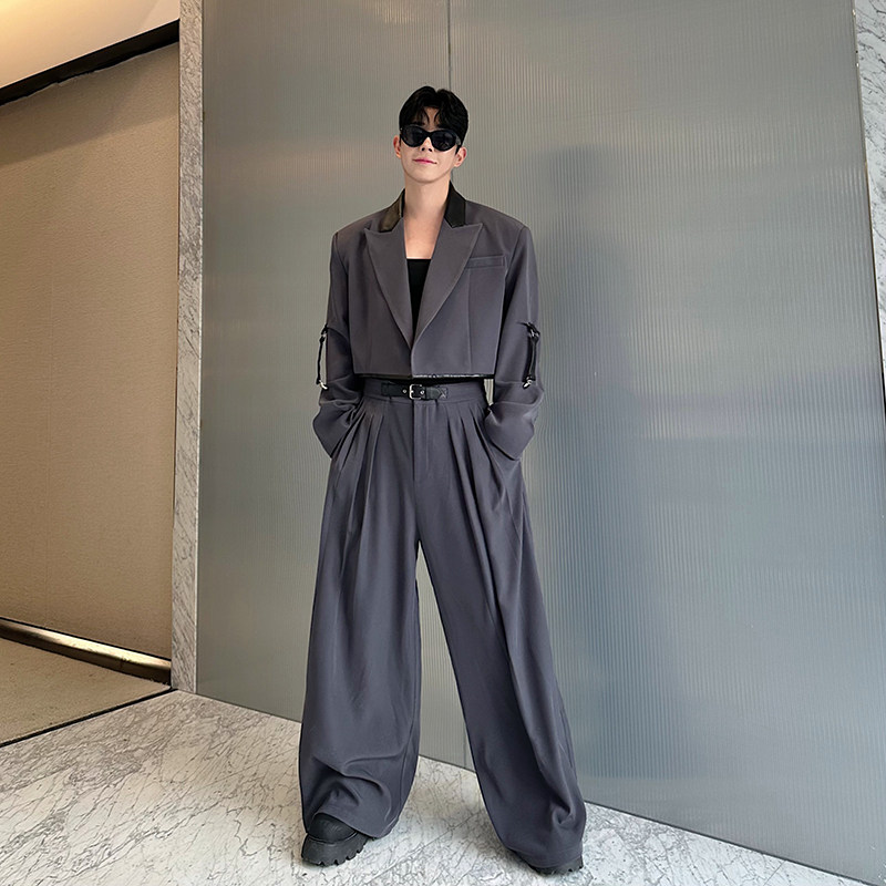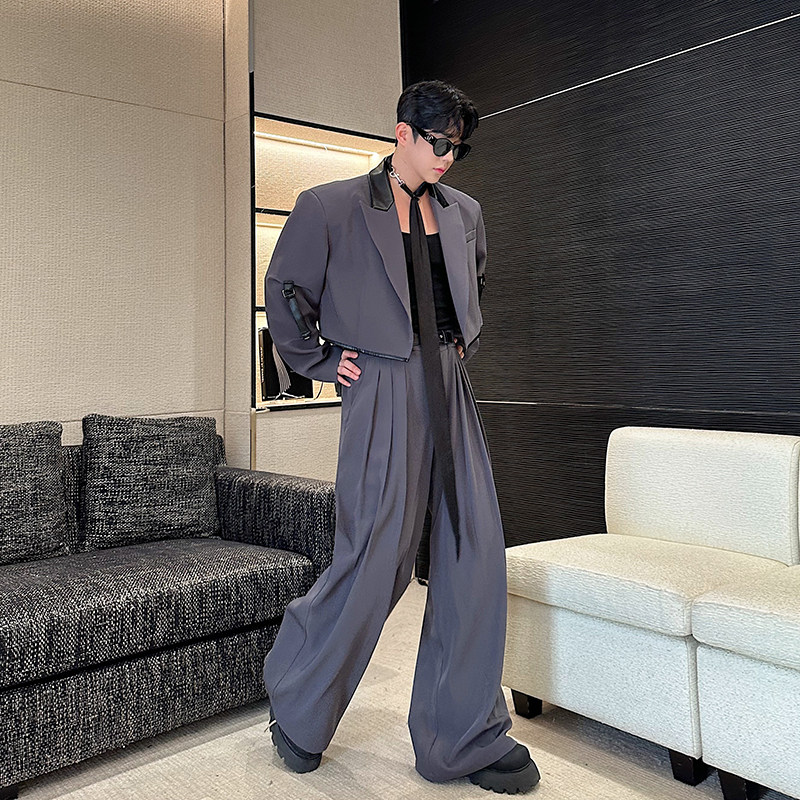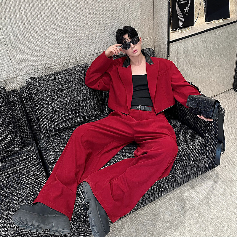 春季小众设计师撞色拼皮设计短款休闲西装垂感阔腿裤两件套装痞帅