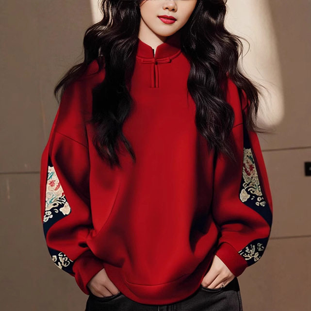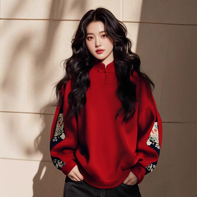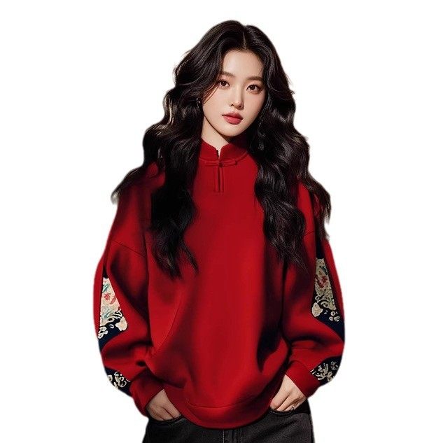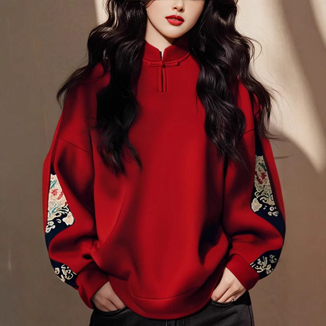 新中式红色套头休闲宽松卫衣女秋冬2025新款百搭高端国风保暖外套