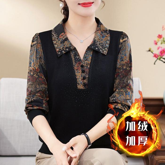 2025秋冬新款加绒加厚长袖中年妈妈衬衫印花拼接打底衫上衣小衫女