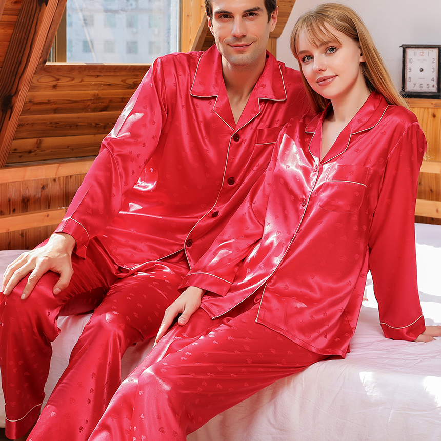 春夏薄款提花冰丝滑家居服女秋季性感大红色仿真丝绸长袖情侣睡衣