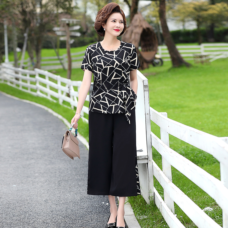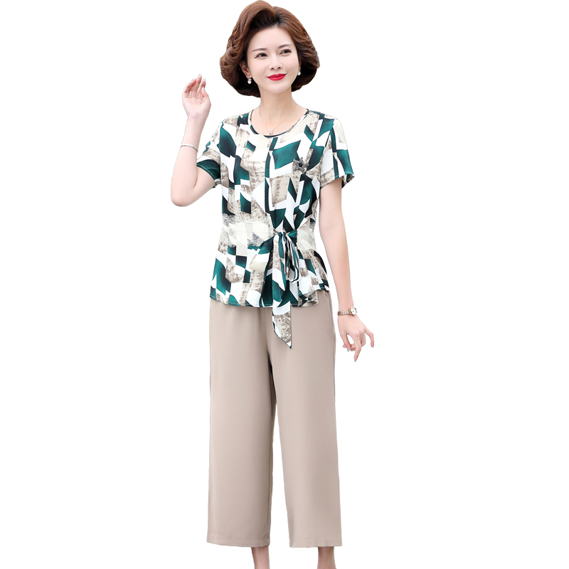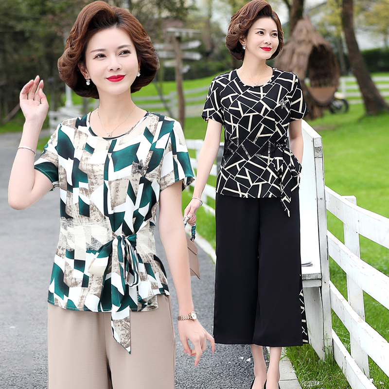 妈妈夏装套装洋气50岁中年女雪纺T恤小衫中老年女短袖上衣两件套