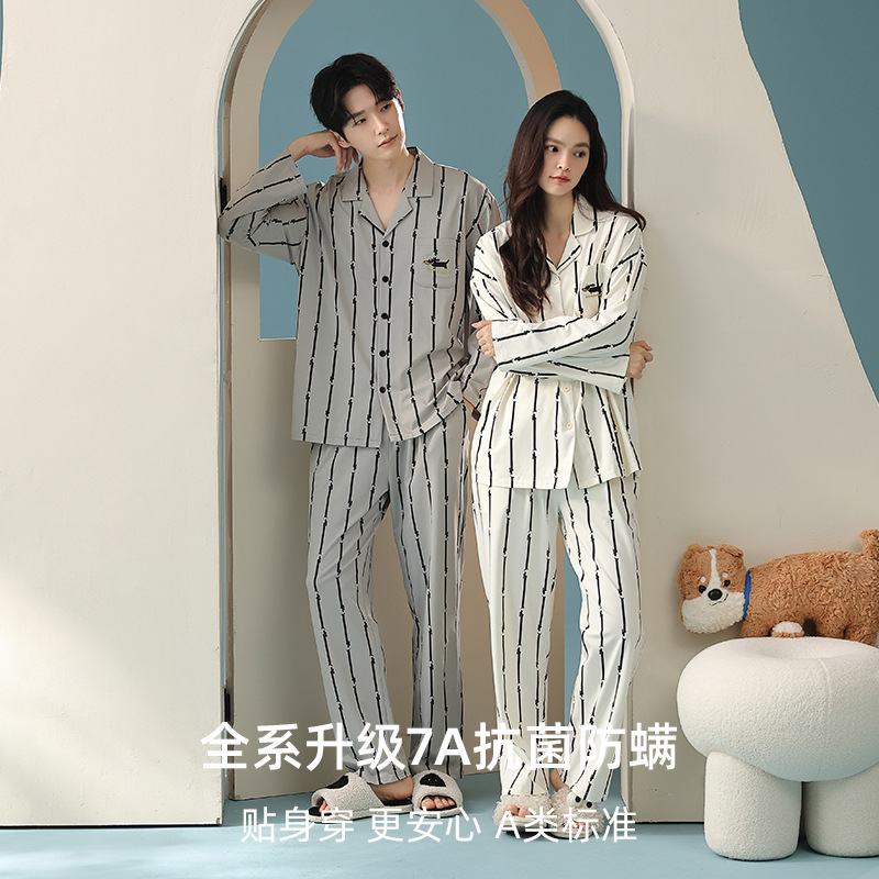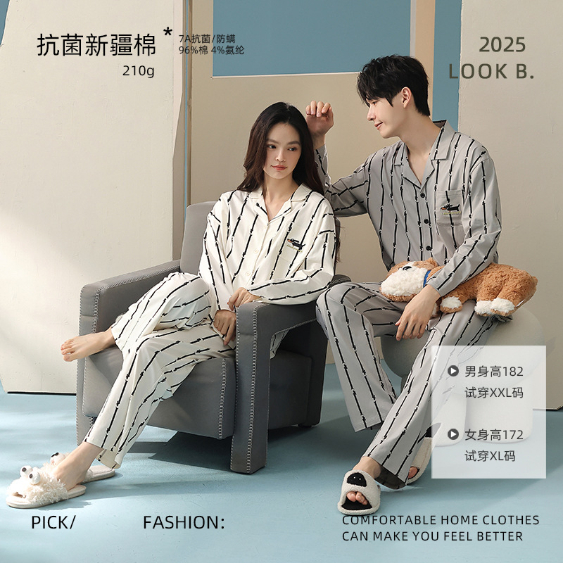 OLAIF抗菌新疆棉秋季新款条纹长袖情侣睡衣纯棉女简约家居服套装
