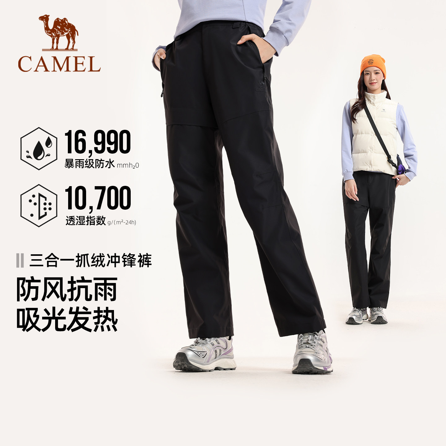 骆驼运动冲锋裤女三合一抓绒内胆防水防风雪山徒步裤登山长裤男