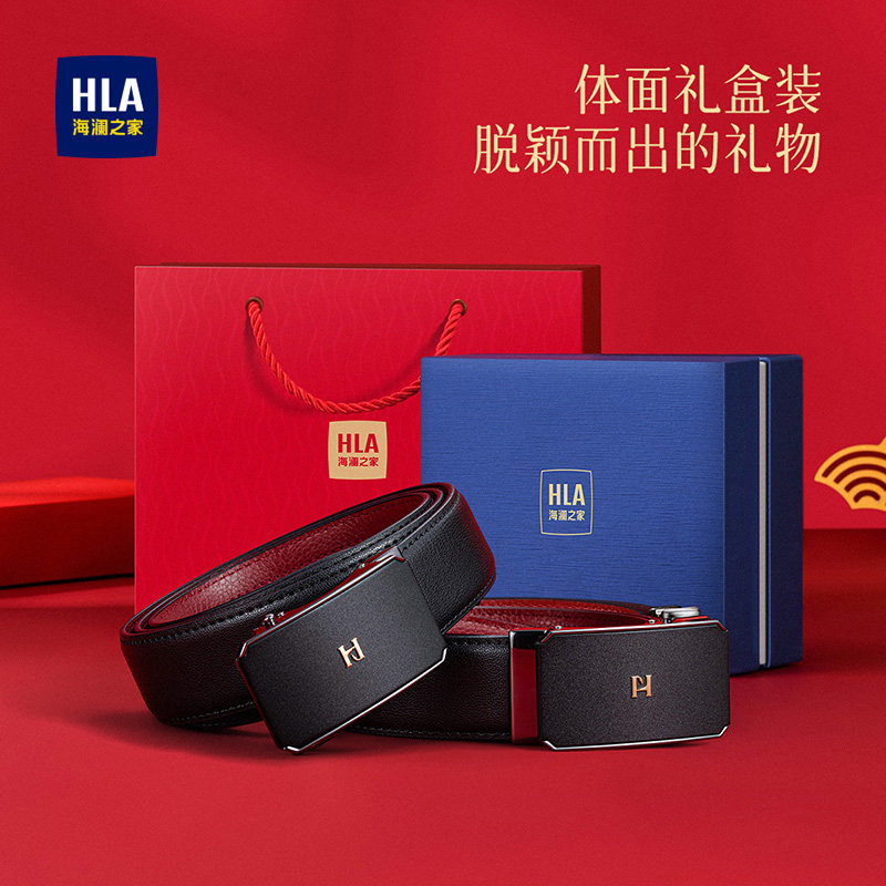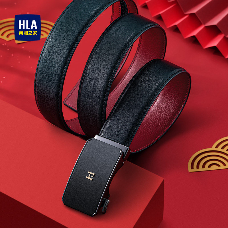 海澜之家真牛皮自动扣腰带男士新款红色加长带身皮带本命年裤带潮