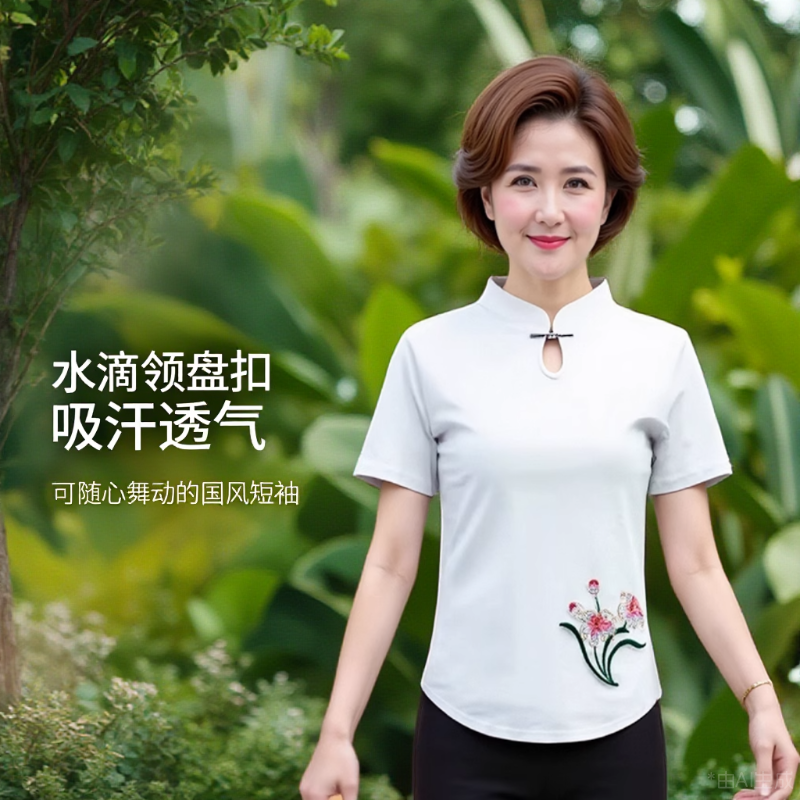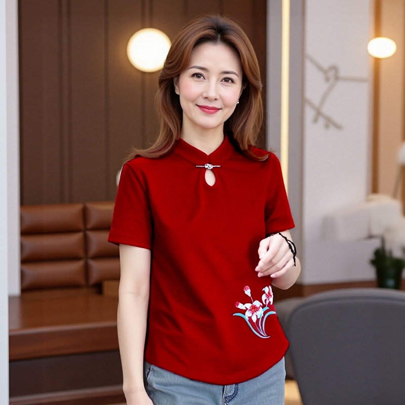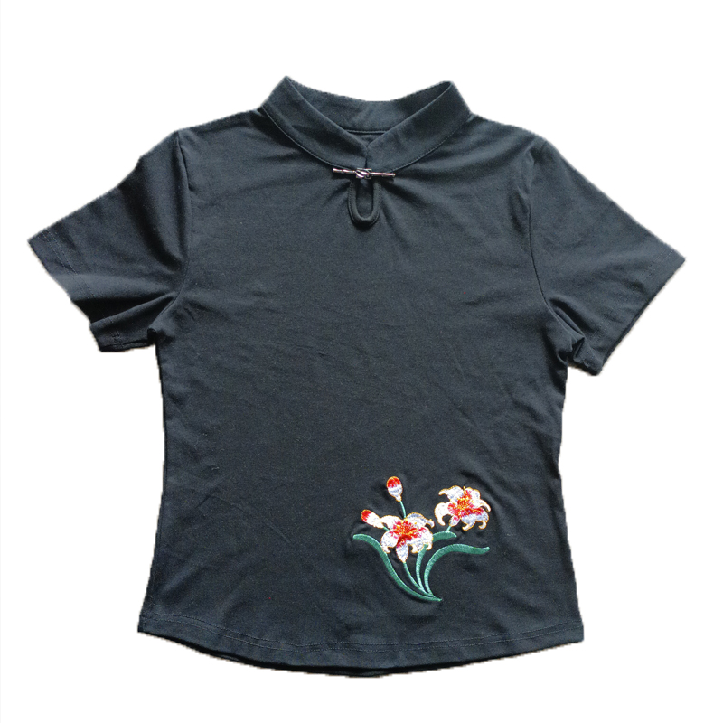 夏新款杨丽萍广场舞服装上衣棉修身国风盘扣跳舞衣服绣花短袖T恤