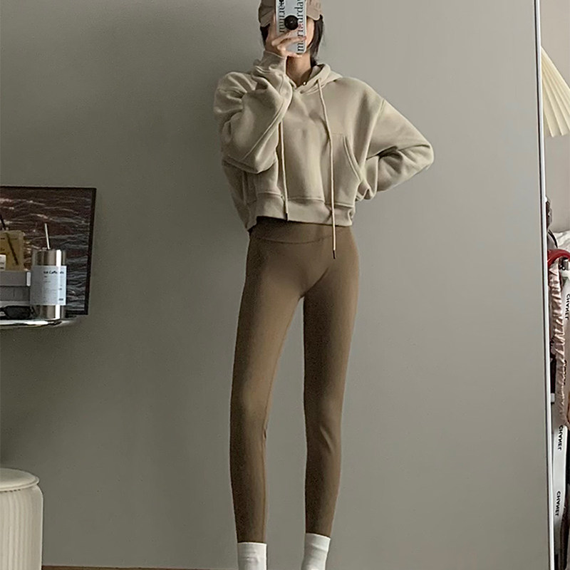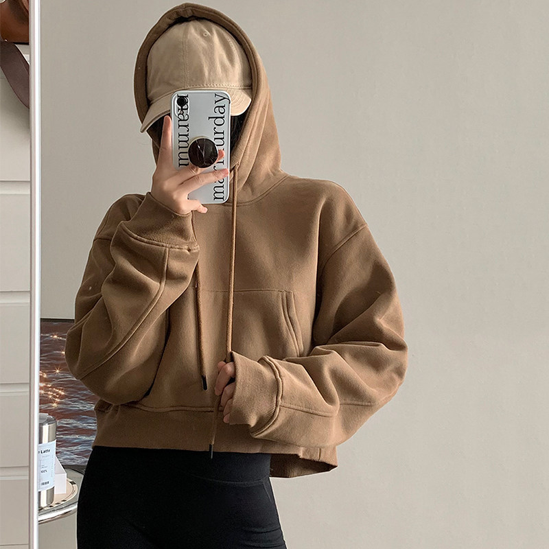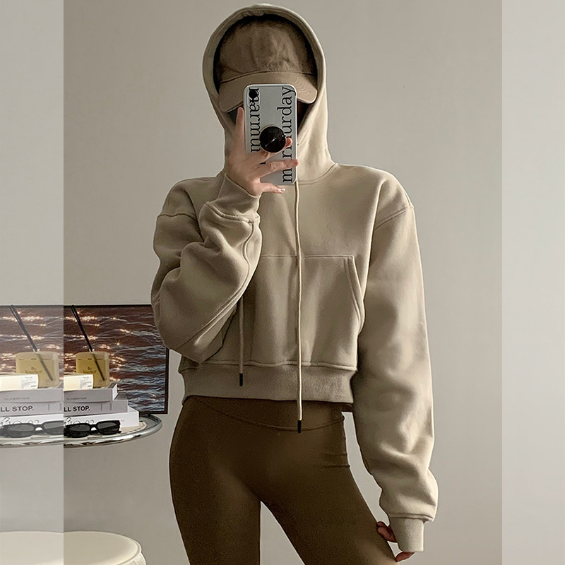 杏色短款连帽加绒卫衣女款秋冬小个子韩系慵懒风休闲套头宽松上衣