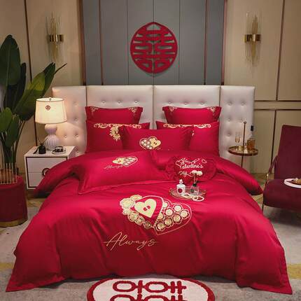 结婚喜庆床上新中式大红色床单被套婚房高档刺绣婚庆四件套婚床品