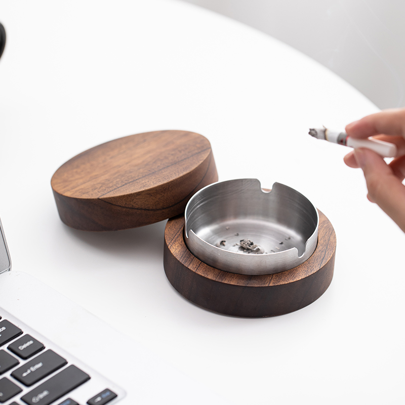 记今朝《胡桃木》烟灰缸 家用客厅 带盖防飞灰 茶桌 烟缸