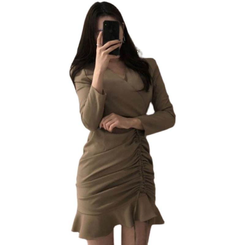 韩版ins春秋新款轻奢抽绳设计荷叶边宽松显瘦高腰短裙V领连衣裙女