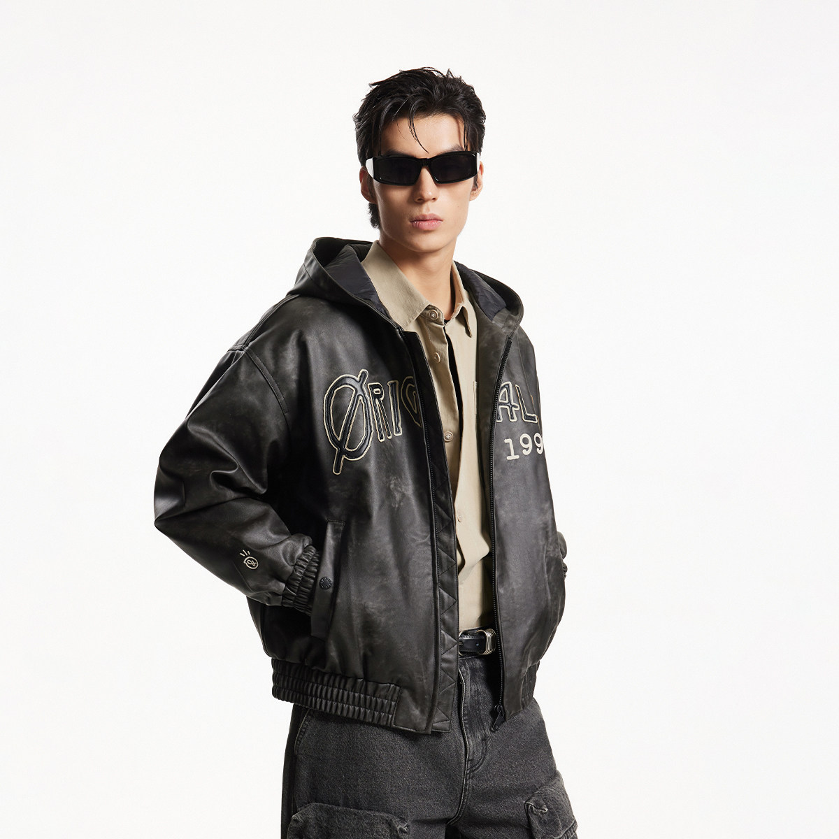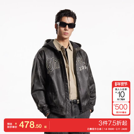 jq区绫致杰克琼斯春季新款字母贴布刺绣略宽松连帽PU棉服外套男款
