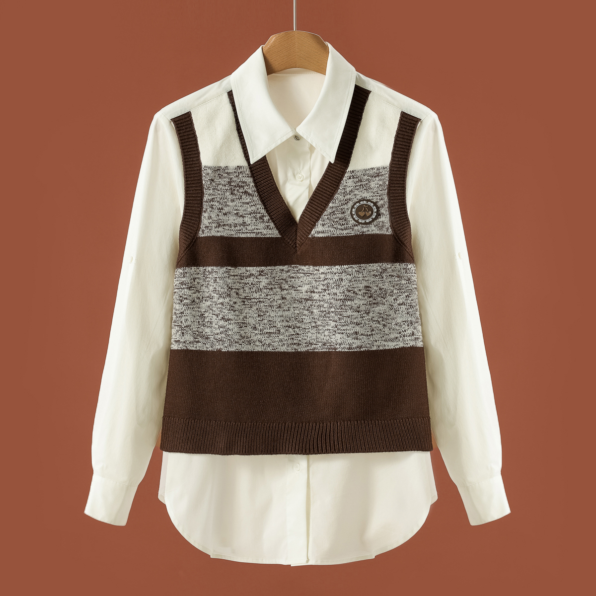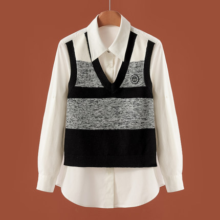 【朗】针织拼接假两件弧形摆宽松套头衬衫007~秋季新款女装