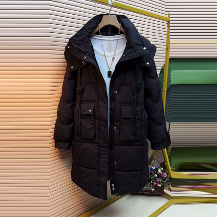 加大码女装连帽抽绳中长款棉服胖妹妹2024秋冬宽松保暖休闲黑外套