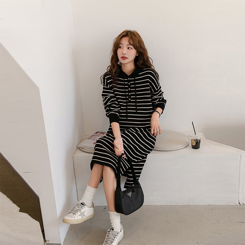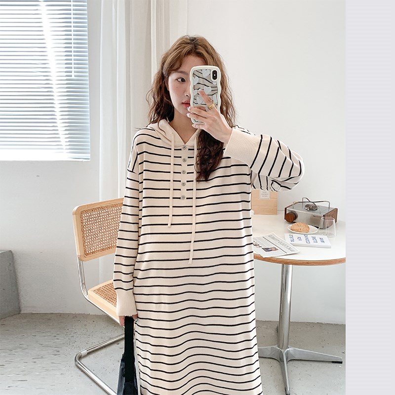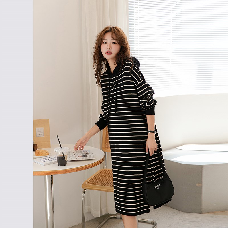 孕妇法式慵懒复古连帽针织连衣裙秋冬时尚宽松气质休Y闲条纹毛衣