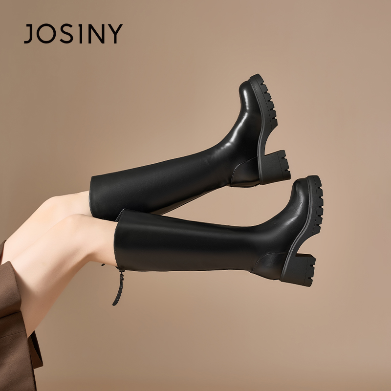 卓诗尼骑士靴女2025秋冬新款v口皮靴高跟不过膝小个子靴子长筒靴