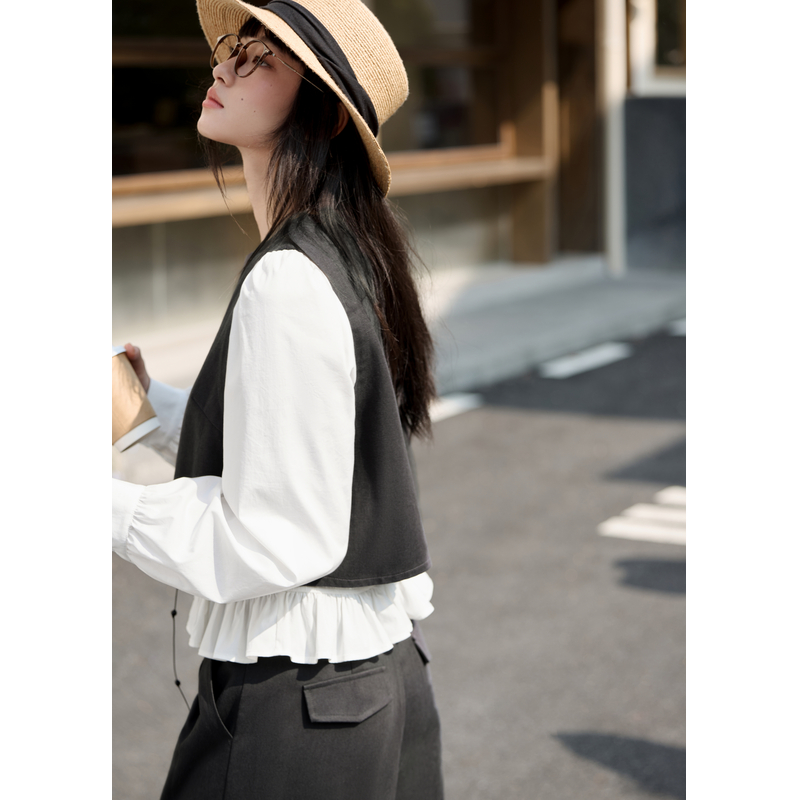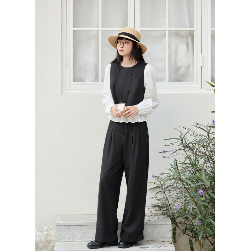 紫涵设计感假两件圆领休闲上衣宽松阔腿长裤两件套装女春秋季新款
