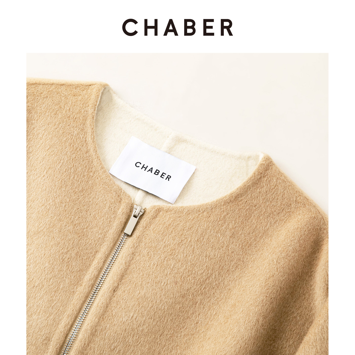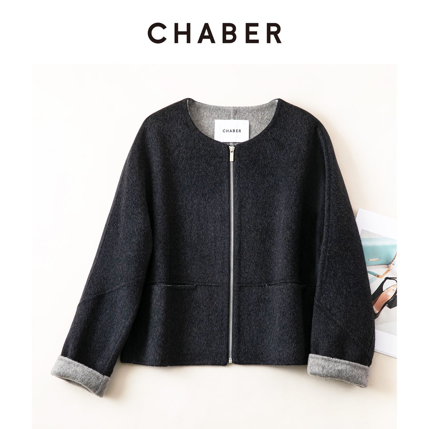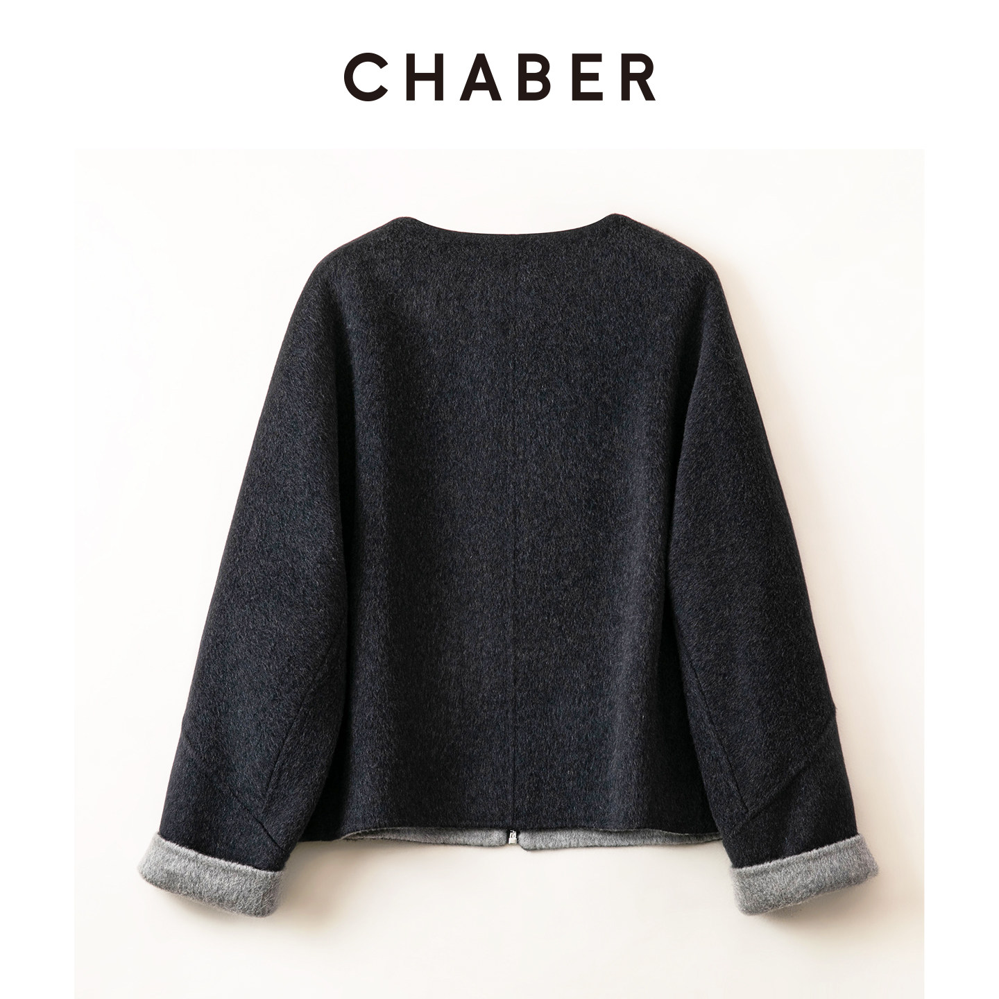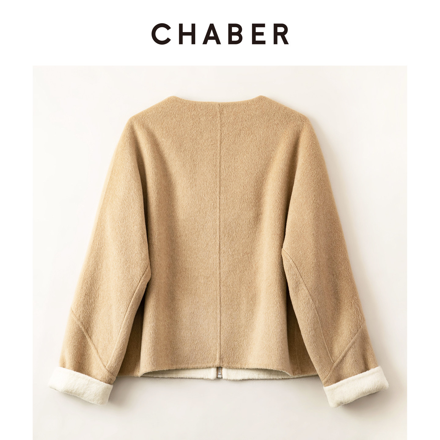 CHABER巧帛冬季新款含山羊绒拉链外套小香风圆领韩版女双面呢大衣