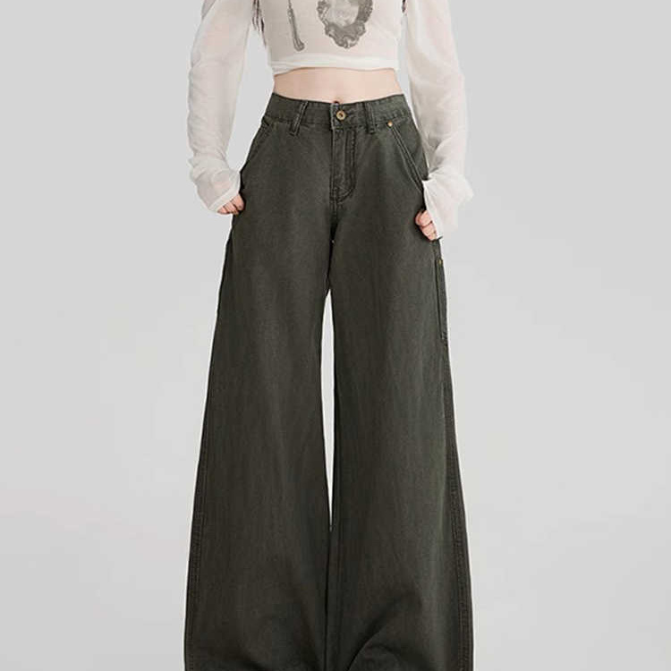 美式复古军绿色工装牛仔裤女秋冬季高腰宽松直筒休闲阔腿拖地裤子