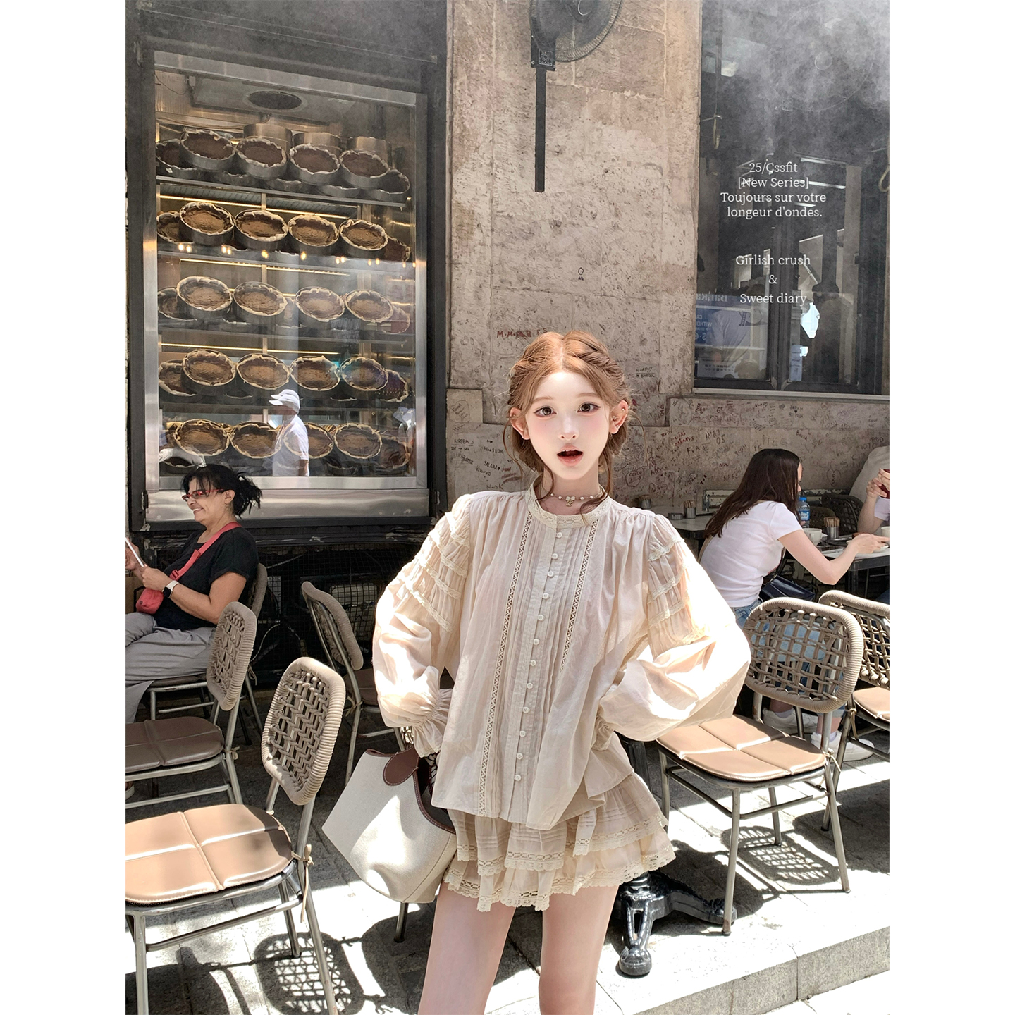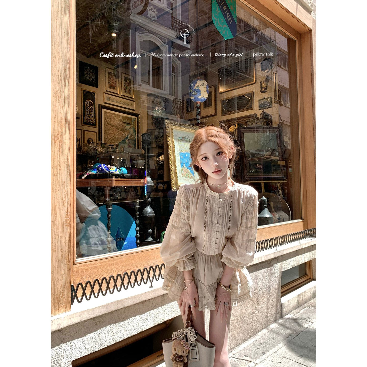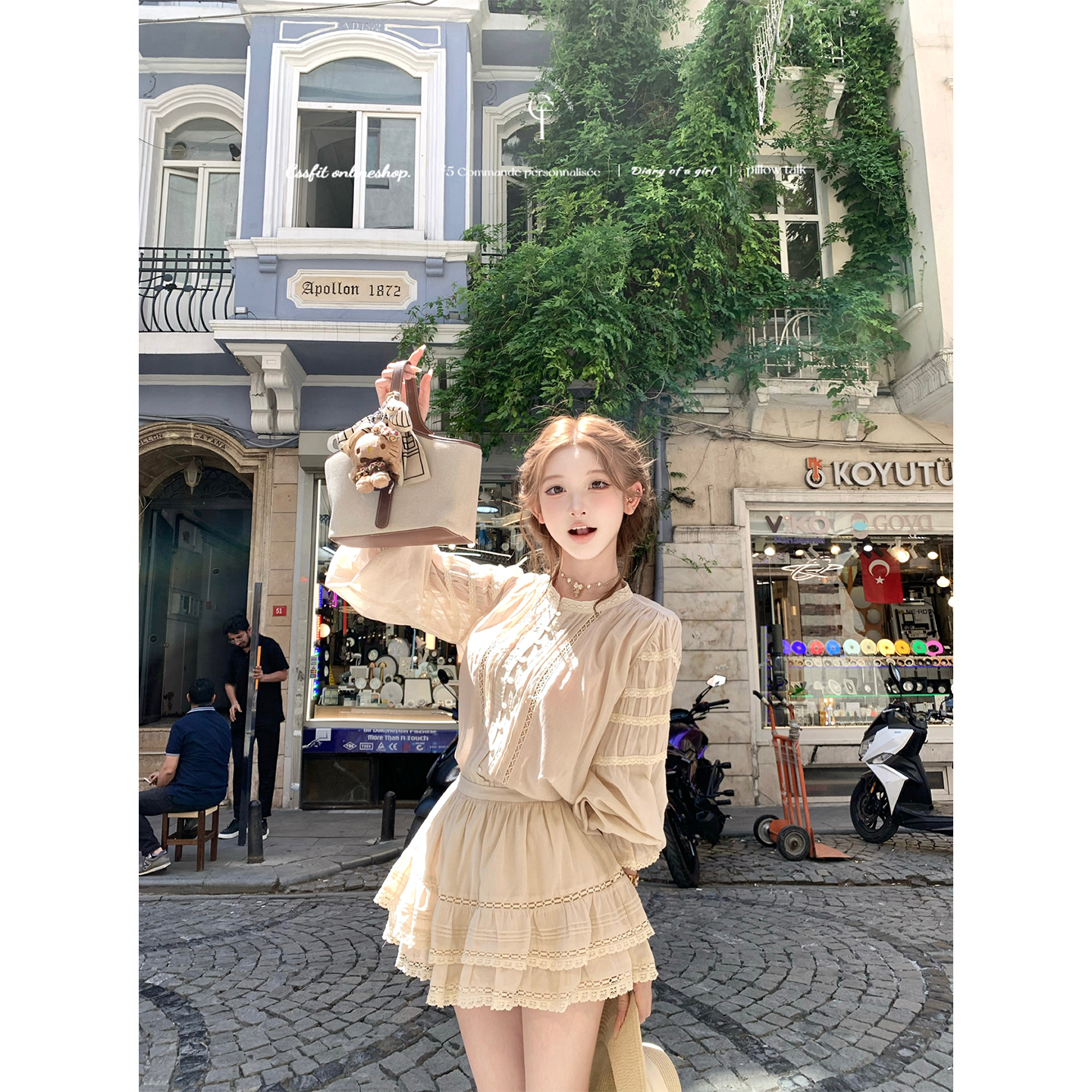 迟伞伞25/fw 和纸呼吸 isabel亚麻色纯棉刺绣花边衬衫短裙套装