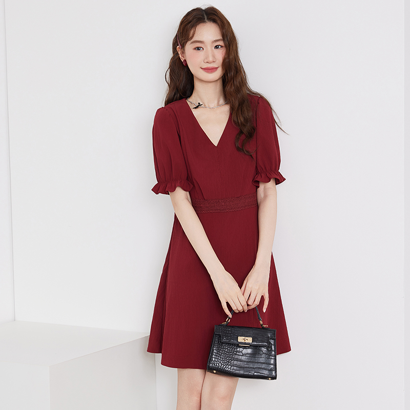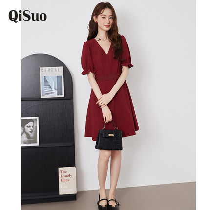 绮娑大码女装夏季新款V领短袖收腰A字裙显瘦遮肉胖mm红色连衣裙