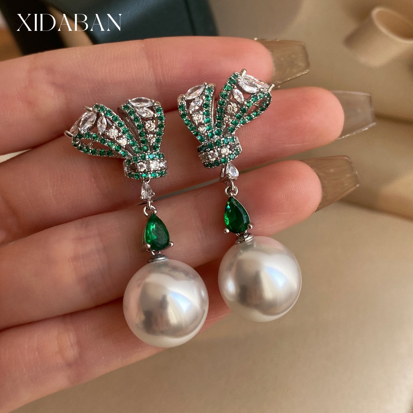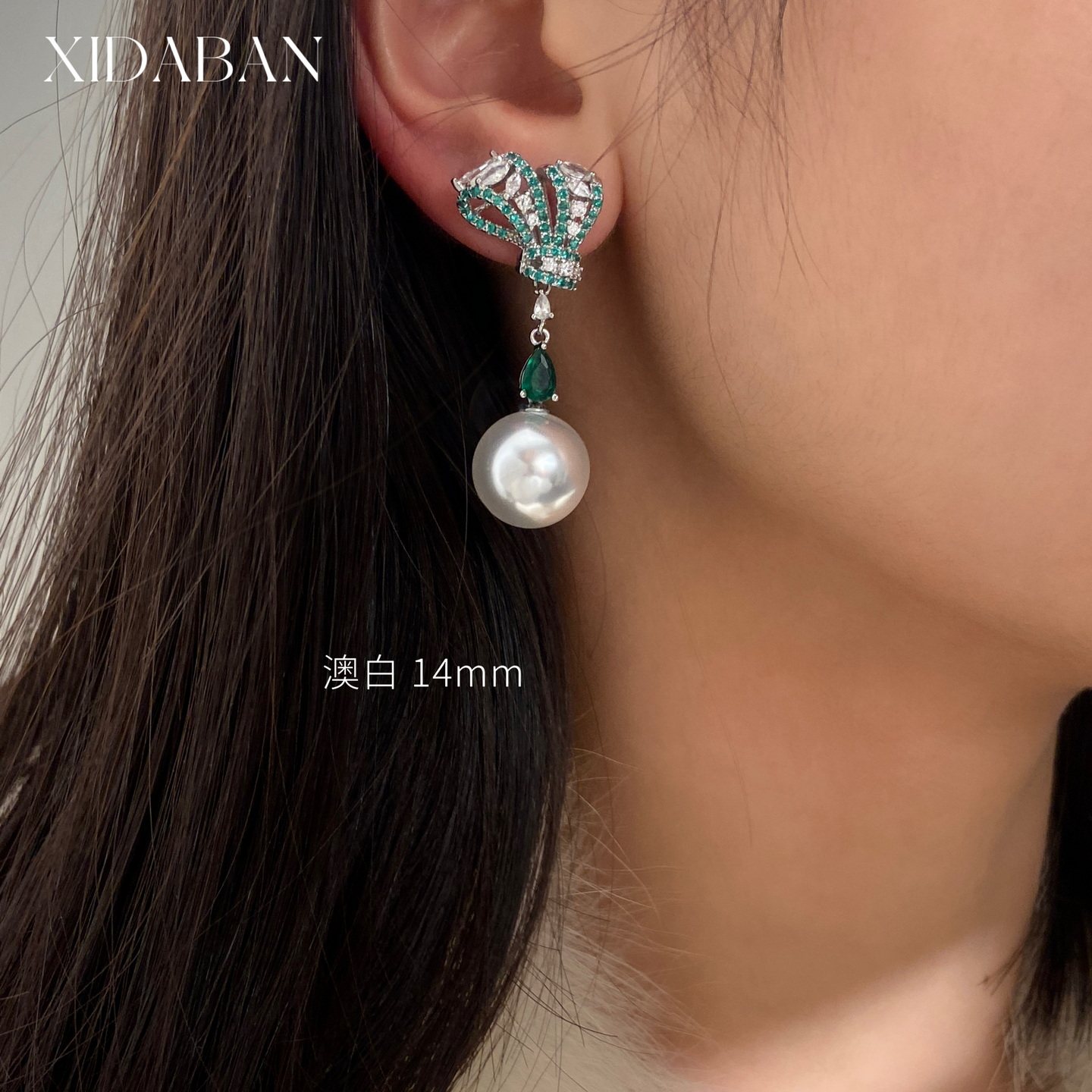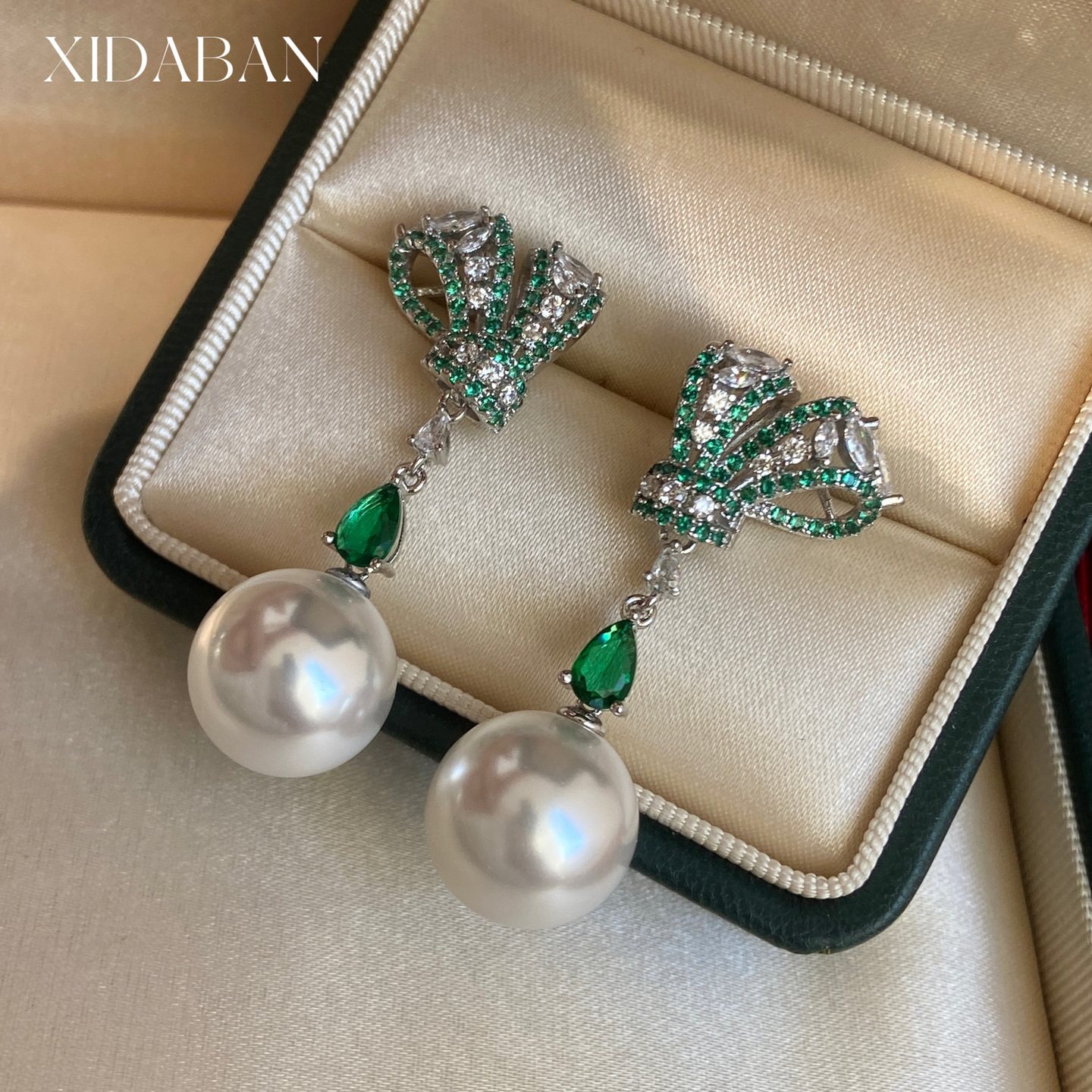 极光正圆仿海水澳白珍珠耳钉轻奢高级感祖母绿满锆蝴蝶绳结耳环女