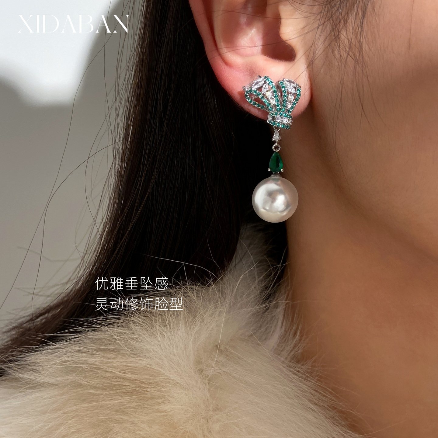 西大班祖母绿蝴蝶绳结珍珠耳环女