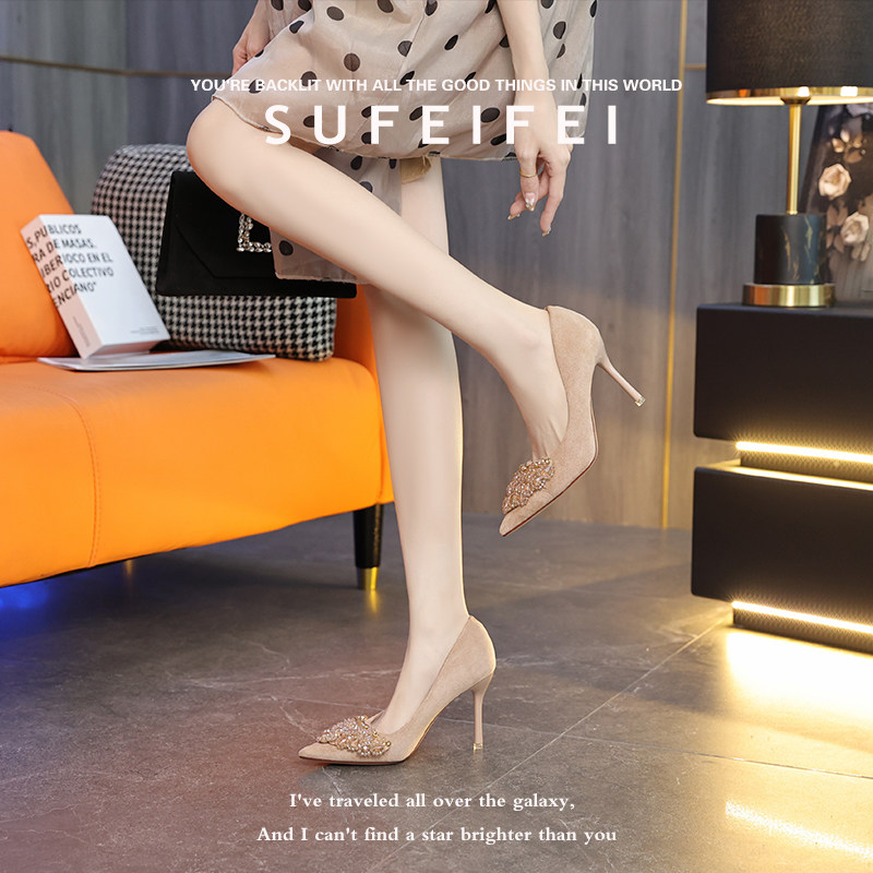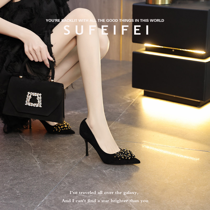 苏妃妃2026新款水钻黑色不累脚高跟鞋女细跟尖头气质高级职业单鞋