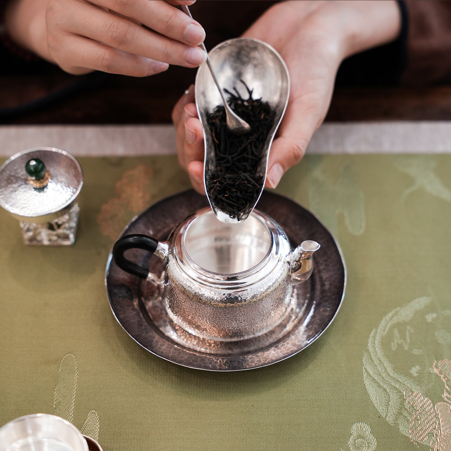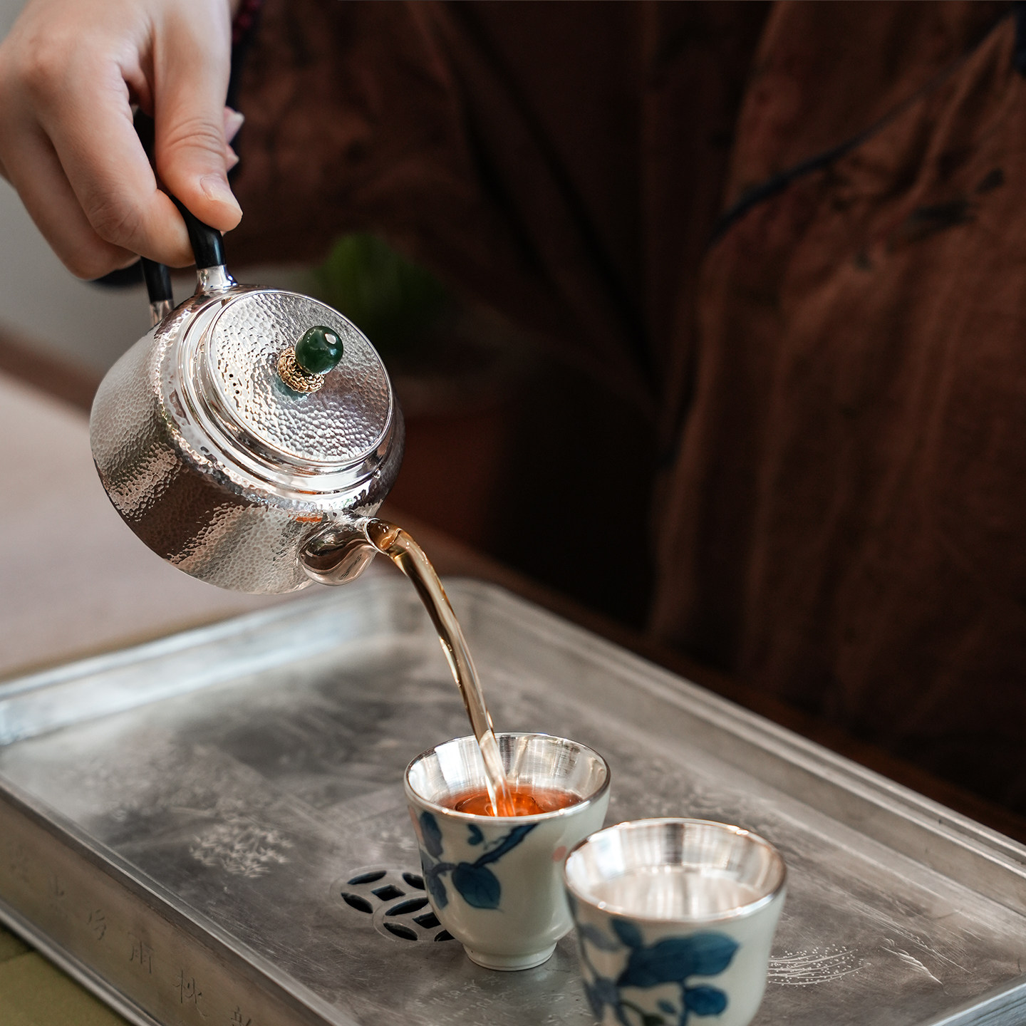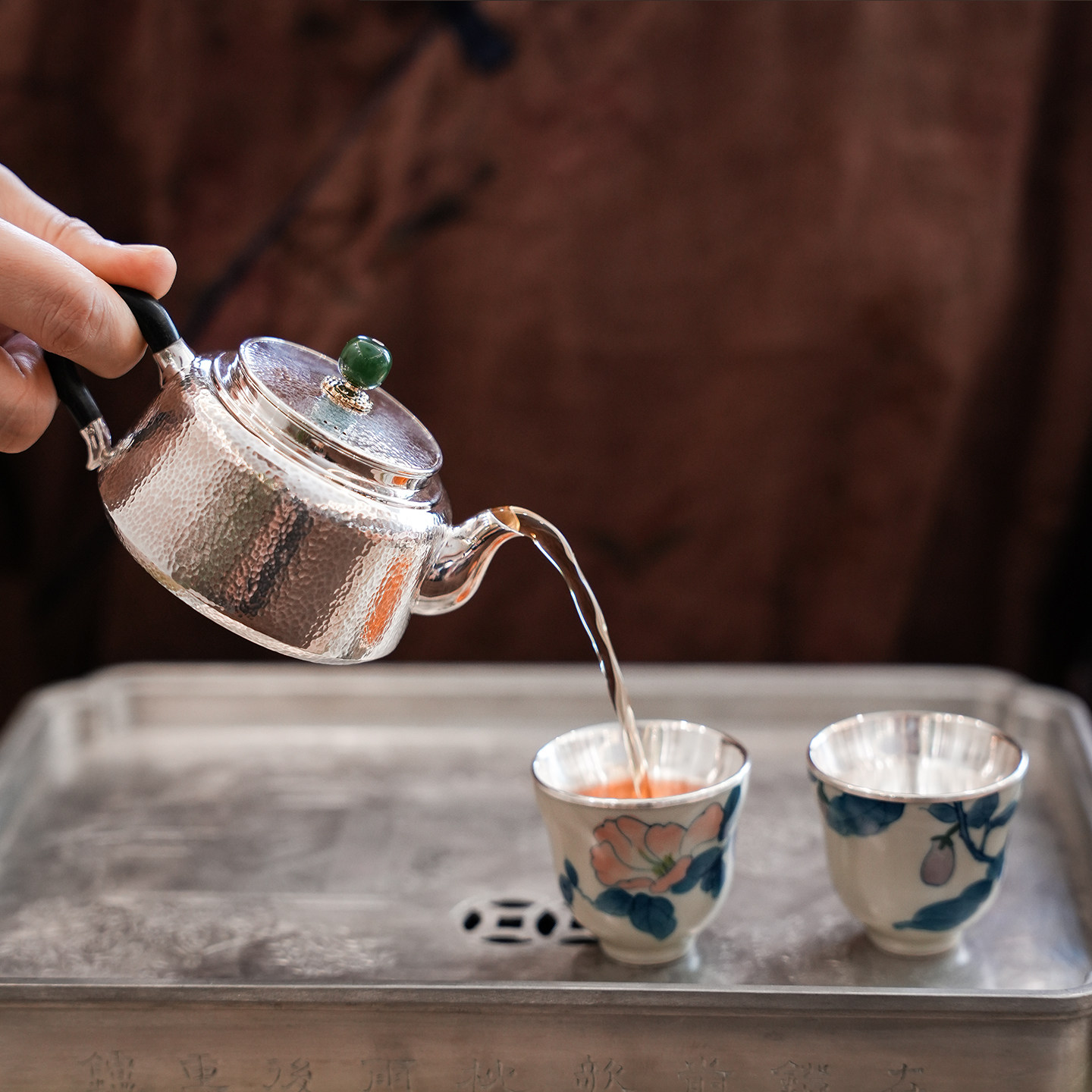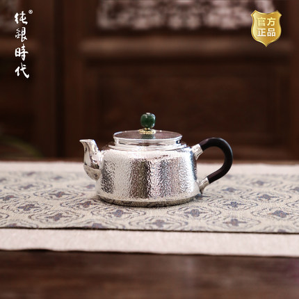 纯银时代 锤纹德钟泡茶壶足银999手工银壶简约檀木把防烫180ml