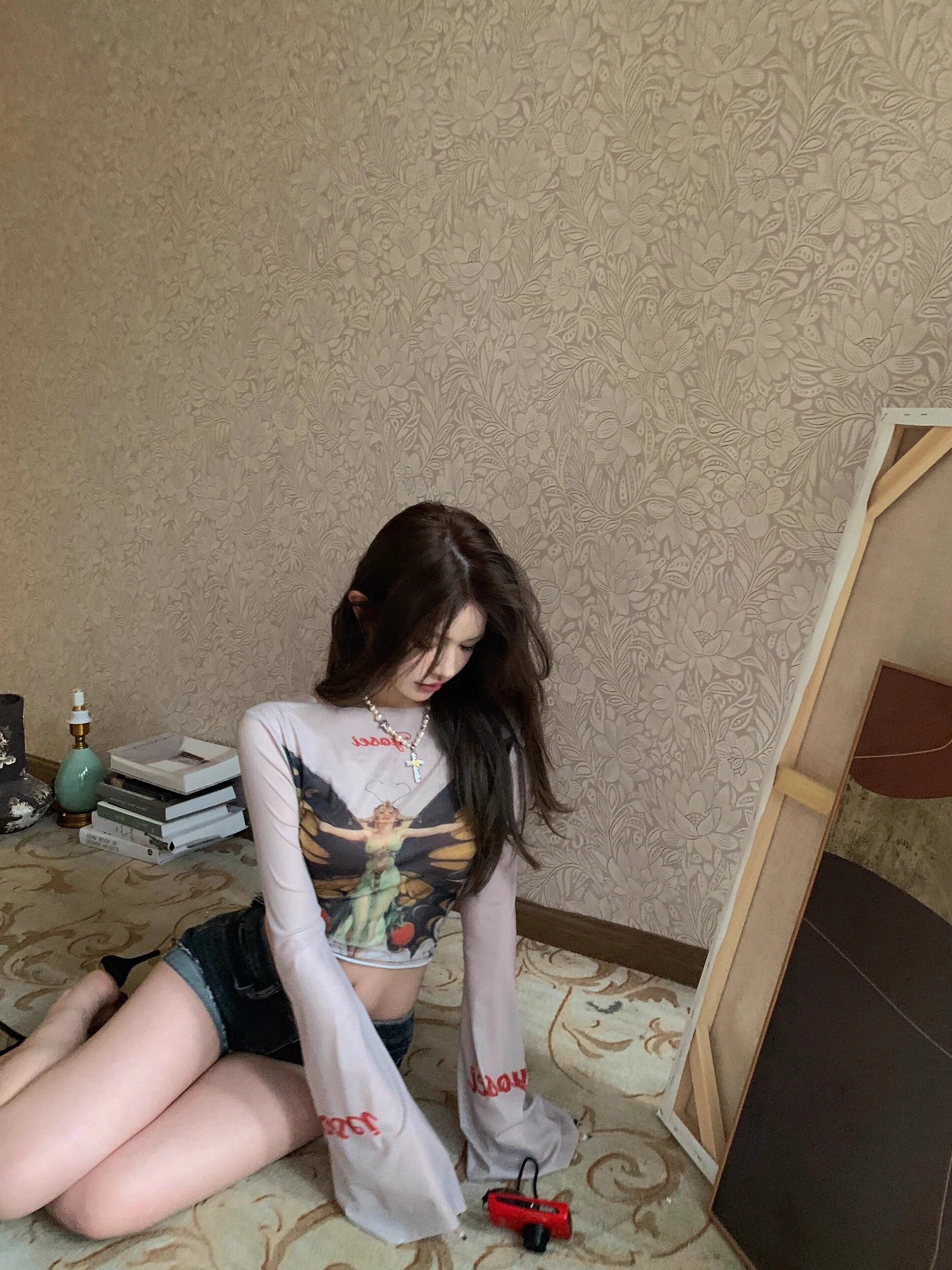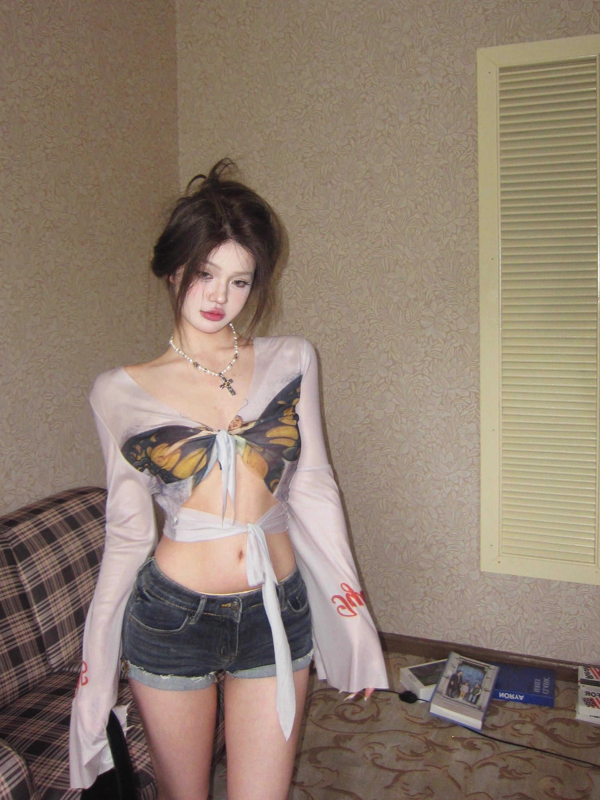原创性感辣妹露背蝴蝶印花网纱T恤女夏绑带上衣