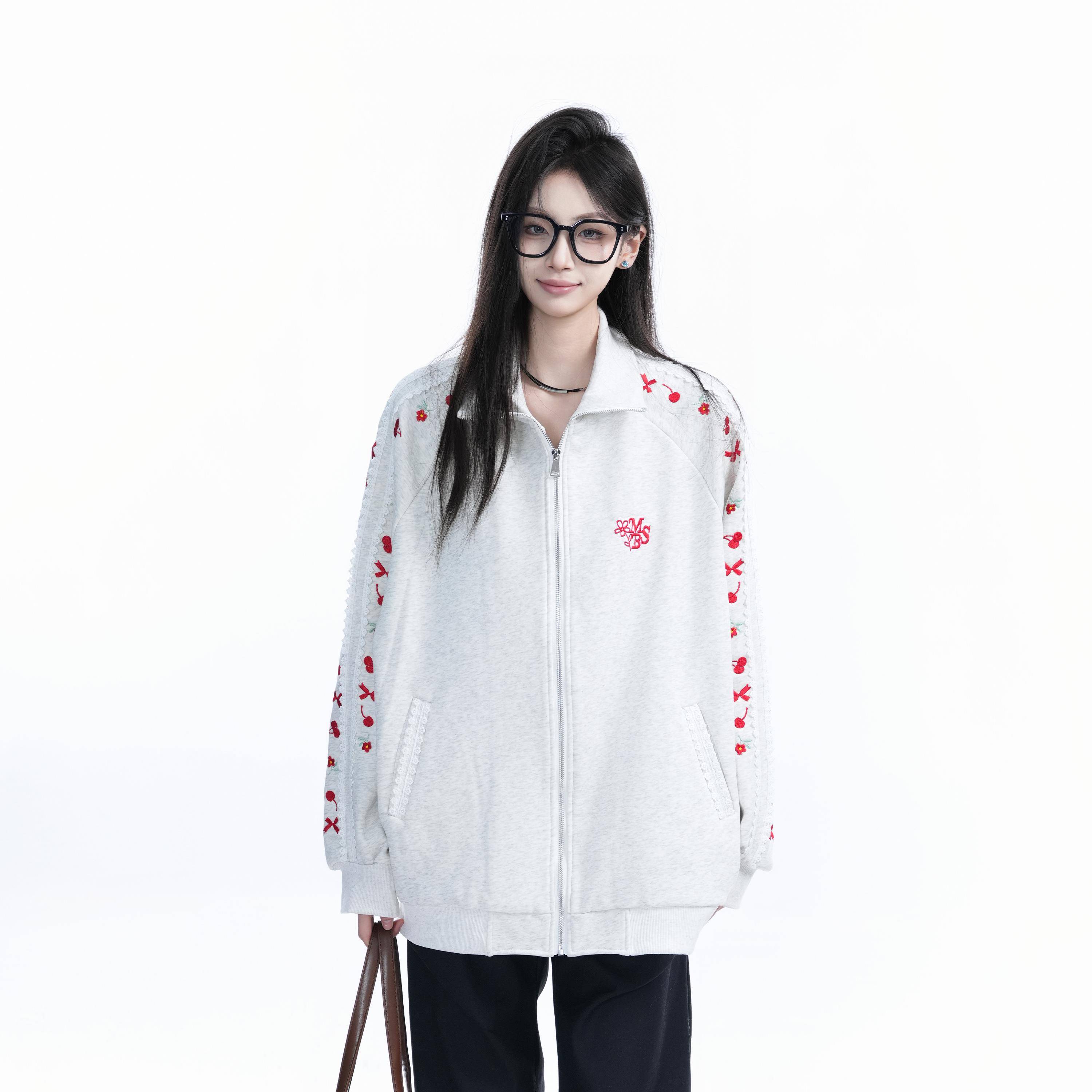 【坐吃山空】美式复古樱桃蝴蝶结刺绣开衫卫衣女加绒宽松拉链外套