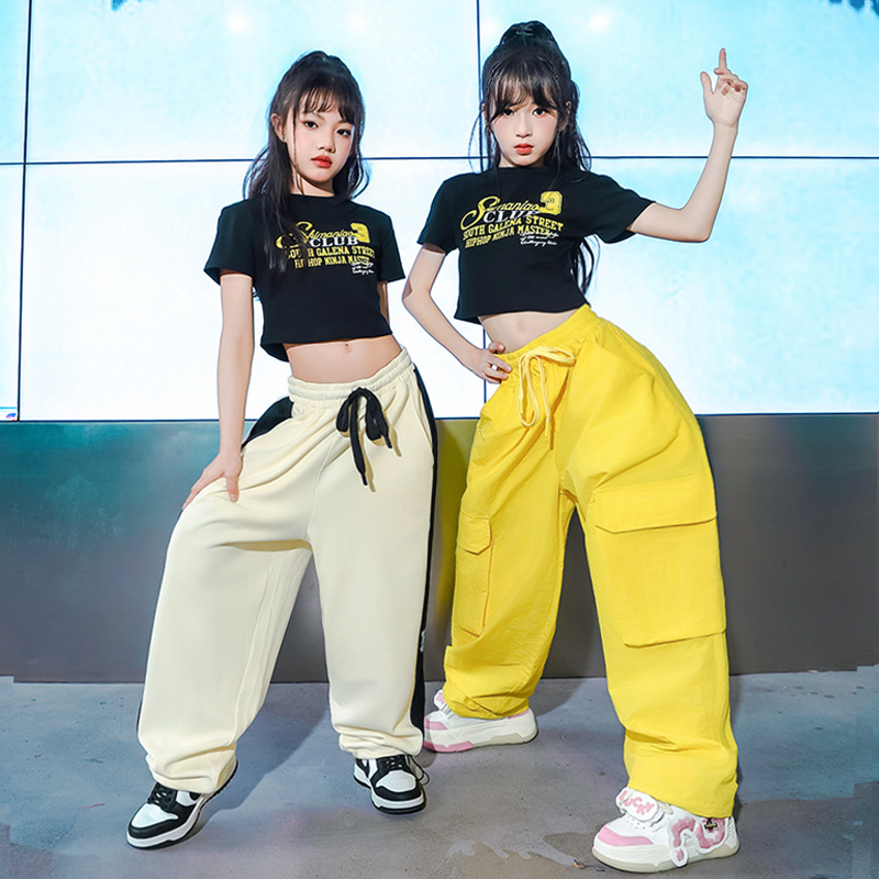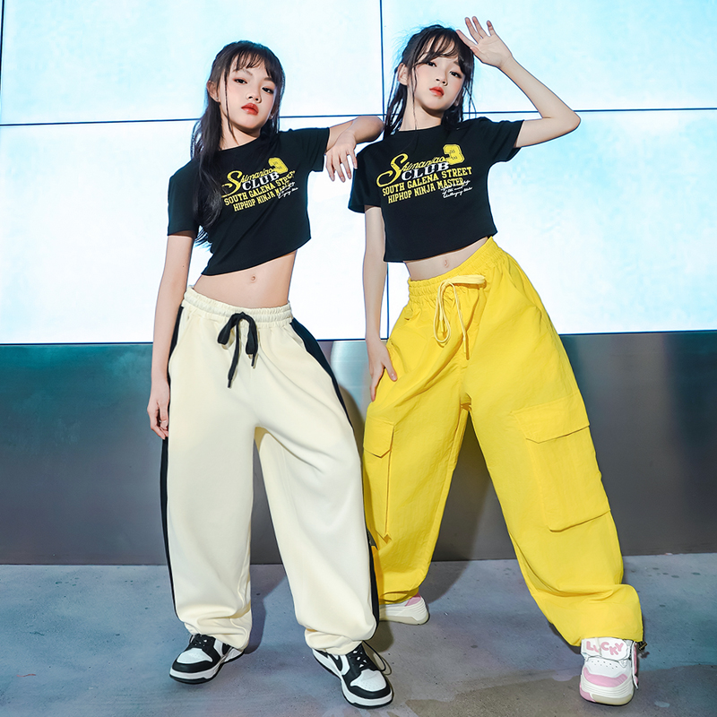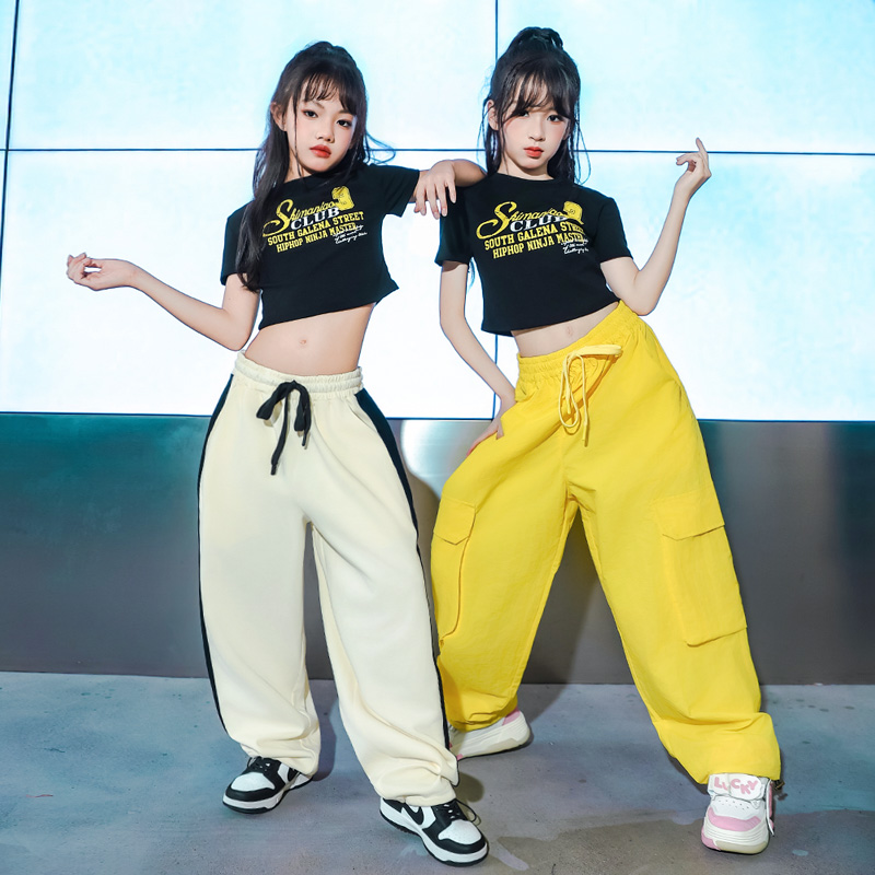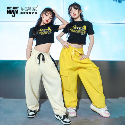 尼恩家女童爵士舞服套装儿童街舞jazz短袖露脐T恤工装裤表演出服