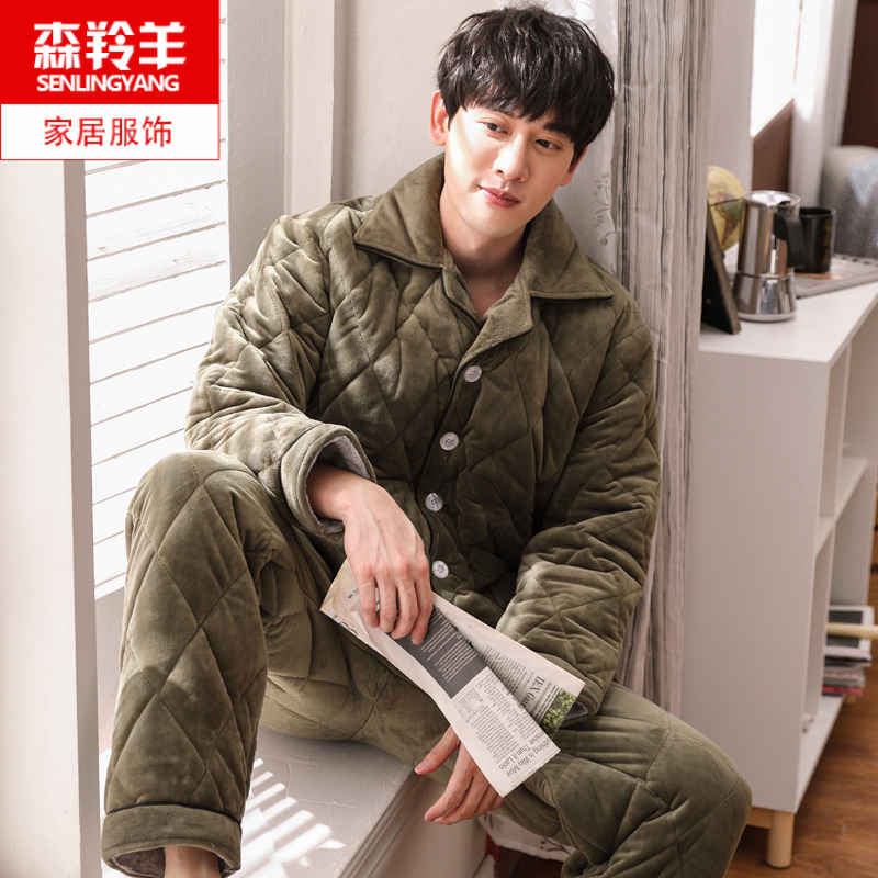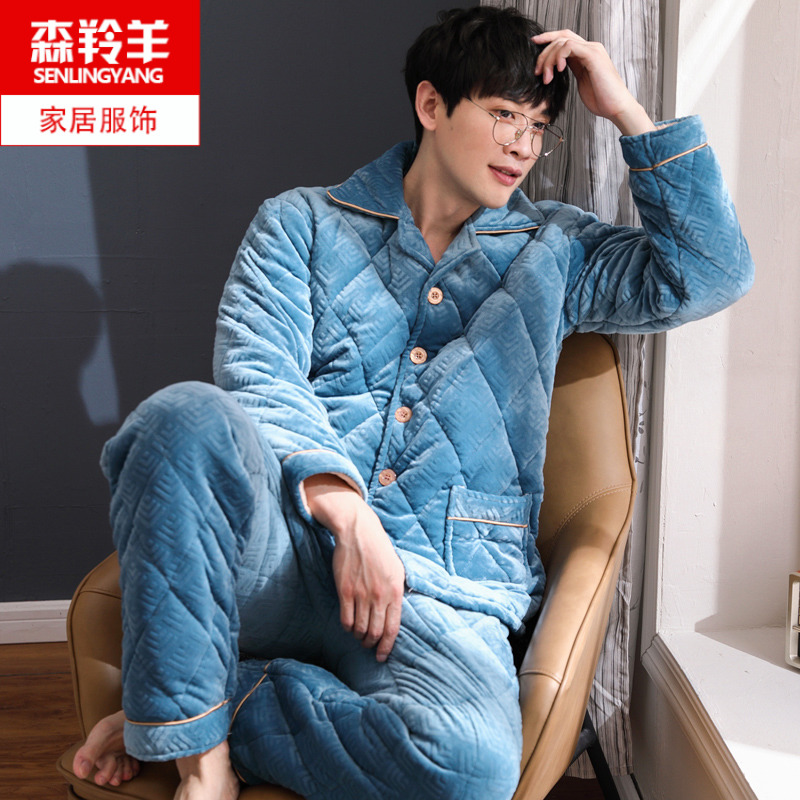 冬睡衣珊瑚绒男三层夹棉加厚加肥加大法兰绒套装胖子家居服中老年