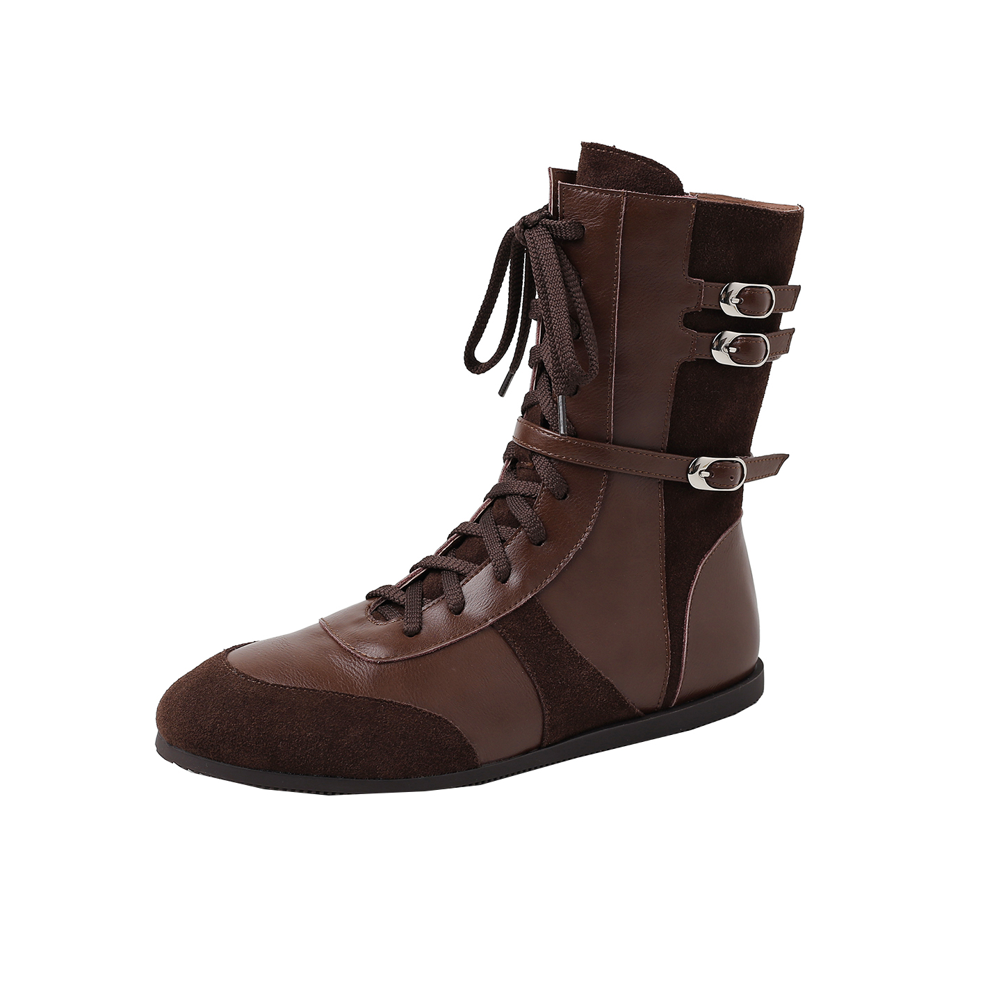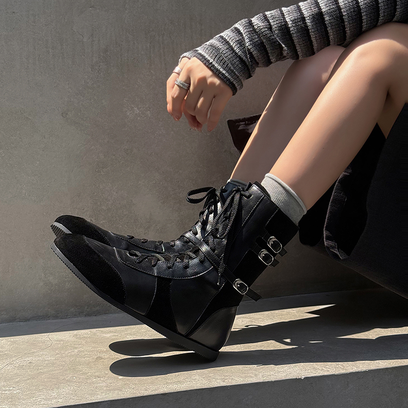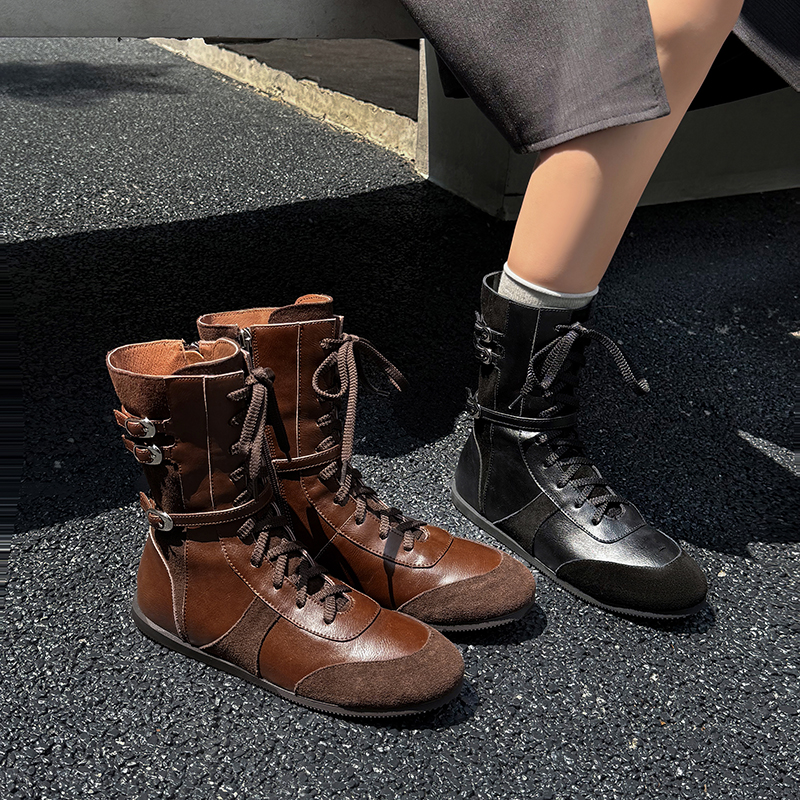 1cm平底真皮马丁靴女2025新款系带拳击靴英伦运动风复古机车靴子
