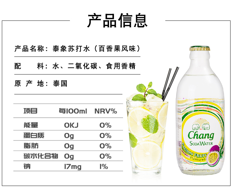 泰象泰国进口chang苏打水百香果味气泡水无糖原装