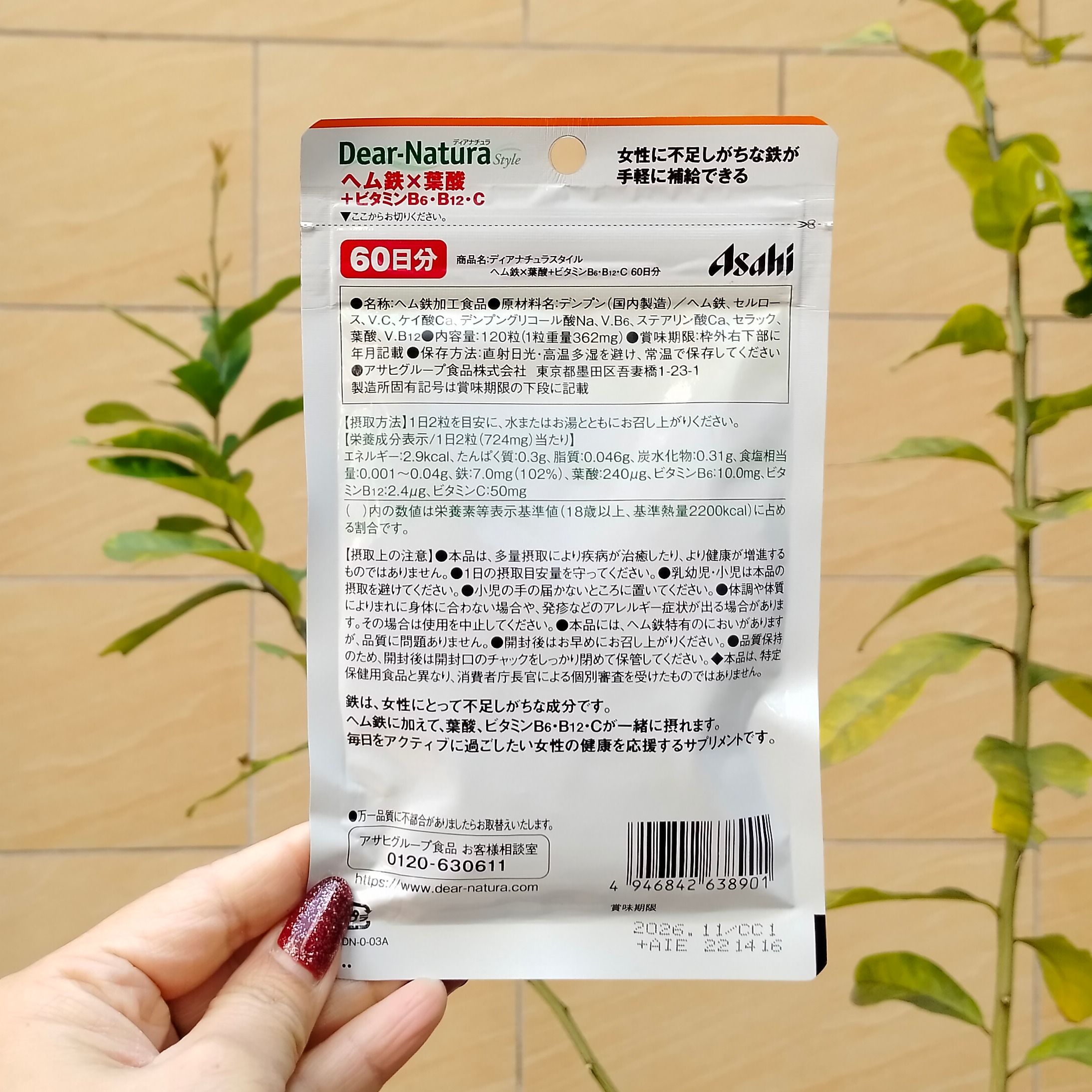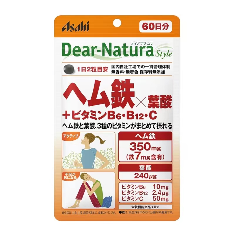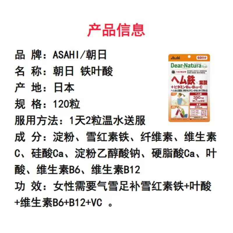 日本代购 Asahi朝日血红素铁+叶酸+维生素B6+B12+VC120粒