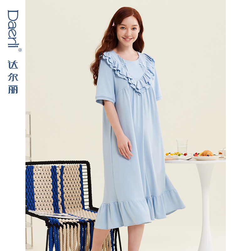 达尔丽纯棉圆领睡裙夏季女款2024新款短袖花边女士一体薄睡衣休闲