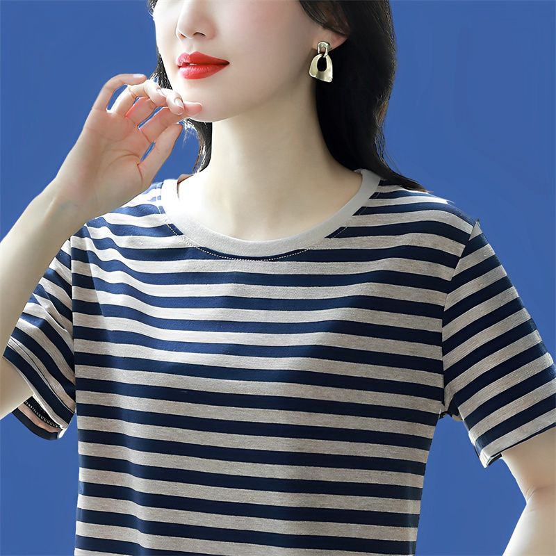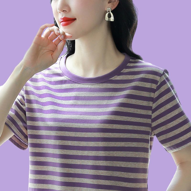 大码短袖t恤女纯棉夏装宽松条纹半袖衫2025新款中年妈妈女士上衣