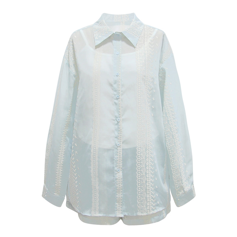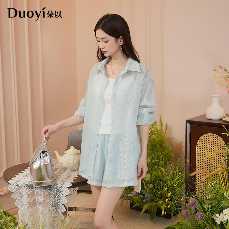 朵以2025秋季新款蓝色轻薄微透衬衫短裤吊带慵懒清新刺绣三件套女