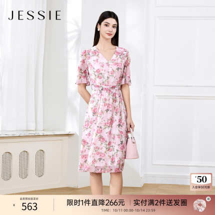 【繁花之境】JESSIE2025夏季新款V领印花连衣裙女气质优雅雪纺裙